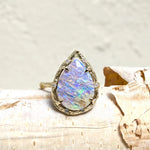 This One of a Kind Australian Opal has the most unique pattern and flashes of green, blue and purple. Wrapped in our willow branch wire, you can see ancient fossilized wood emerging from beneath the lilac hue. Available to ship in size 5.5.