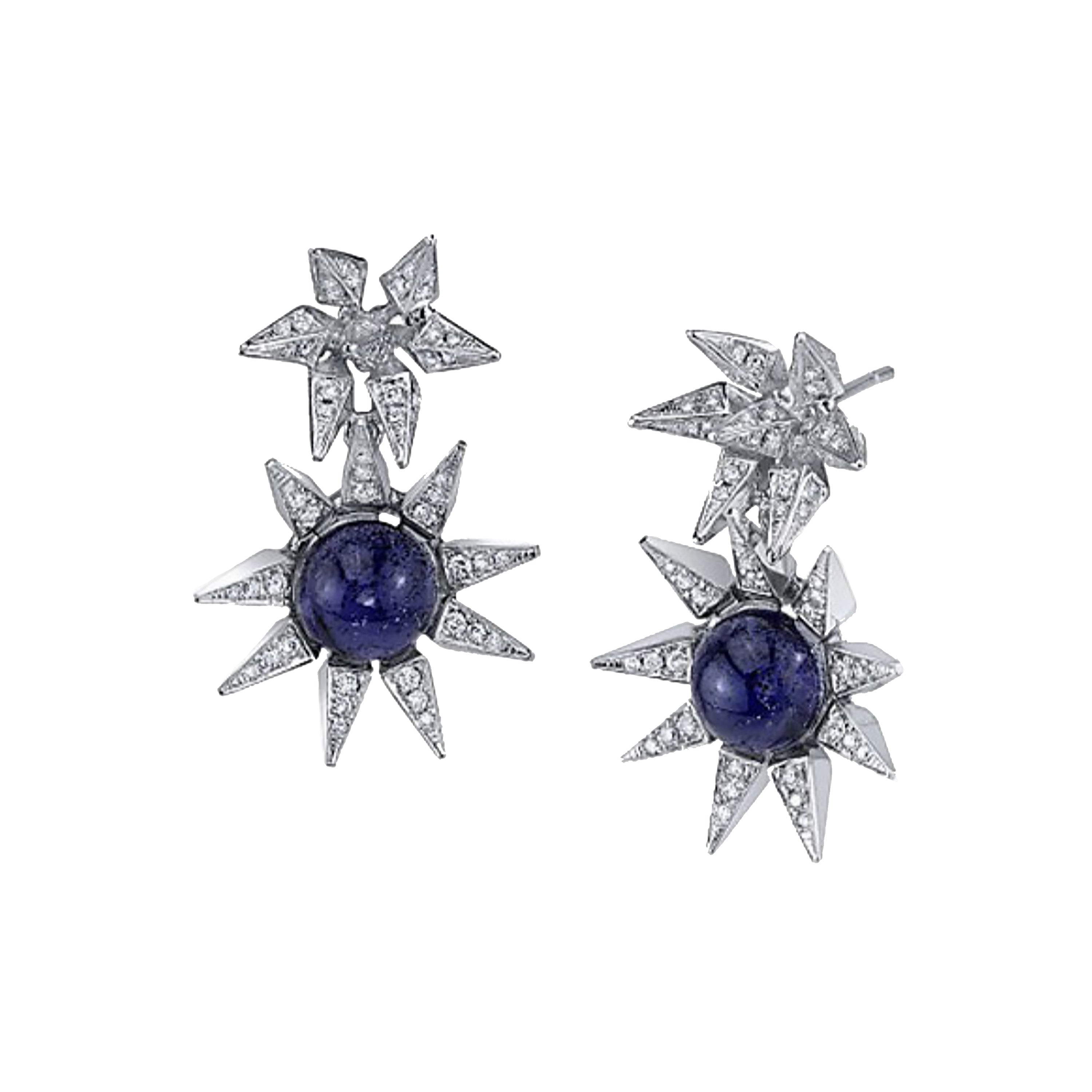From the Rock Hall Collection, these stunning spike, Iolite earrings feature 1.15ct white Diamonds. Set in 18k White Gold. Sold as a pair.