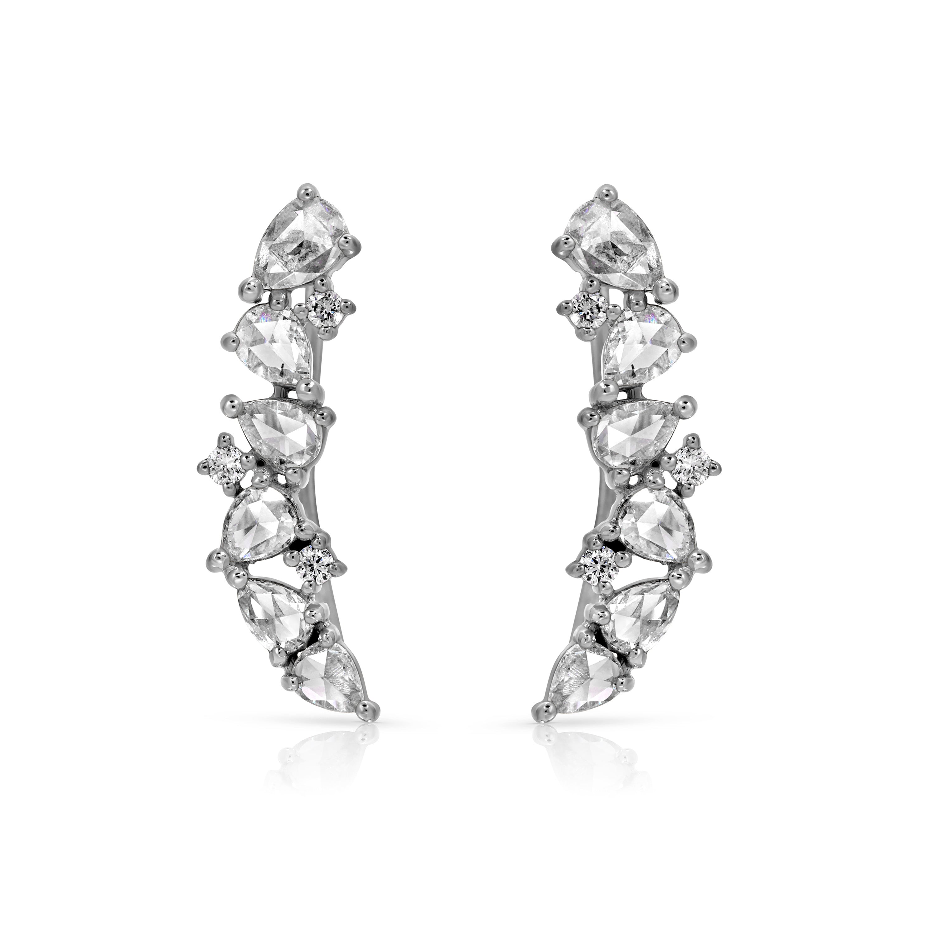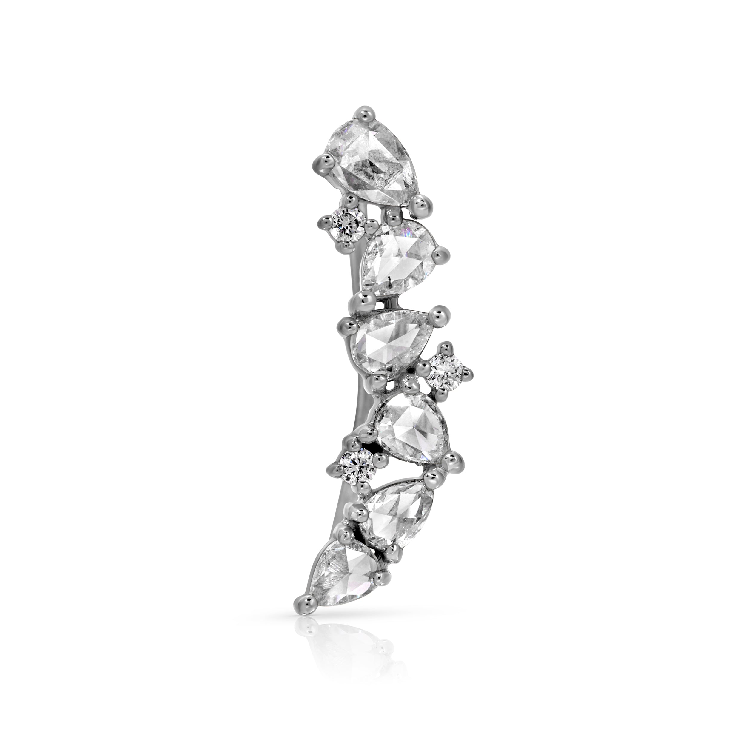 Earring with pear-shaped shaped stones. Earring features prong-set round Diamonds. Wear as a long drop or an ear crawler, curves along the ear.