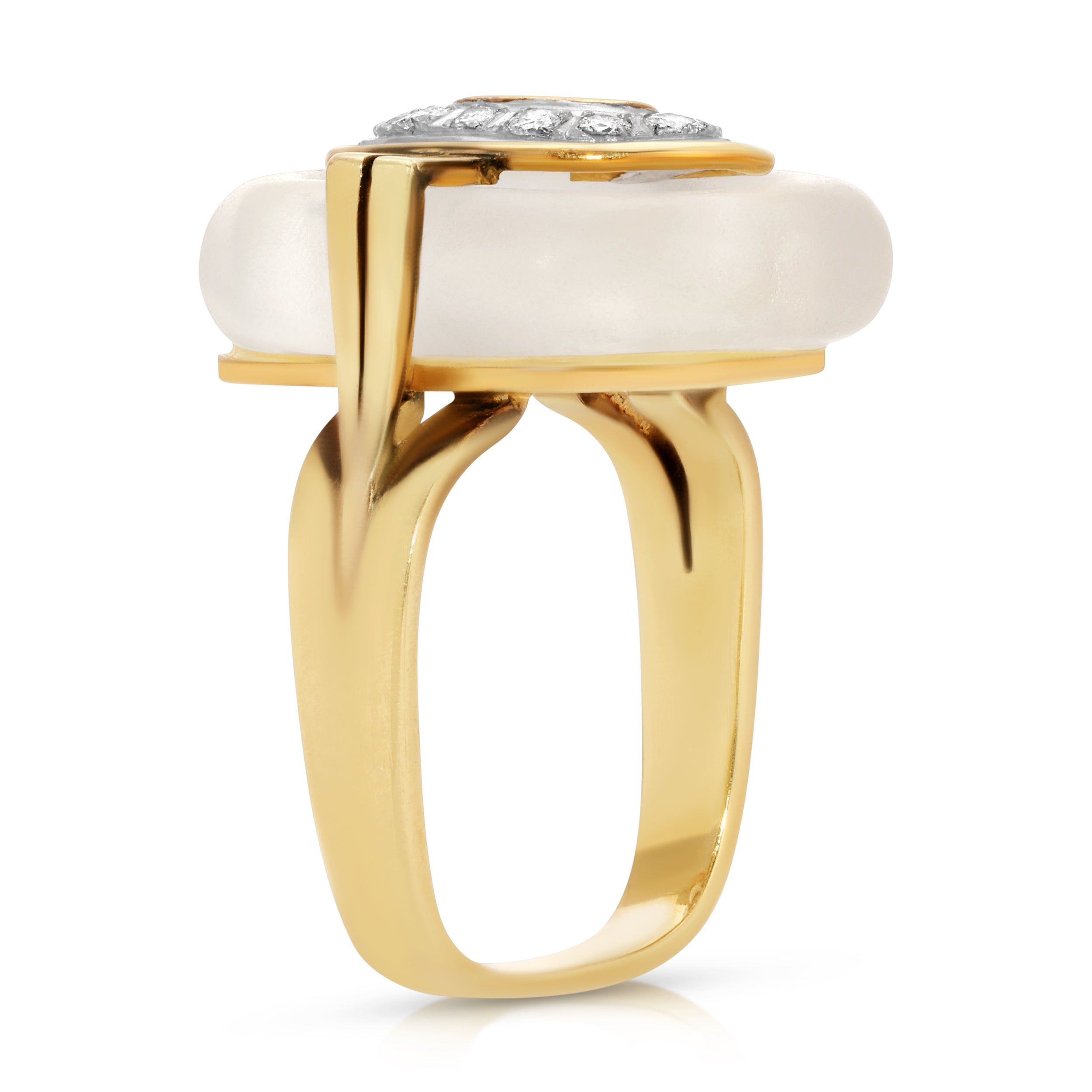 Antique 1940s/50s Camphor Glass ring with a center wave detail. Center wave is 14k white Gold with inset Diamonds.