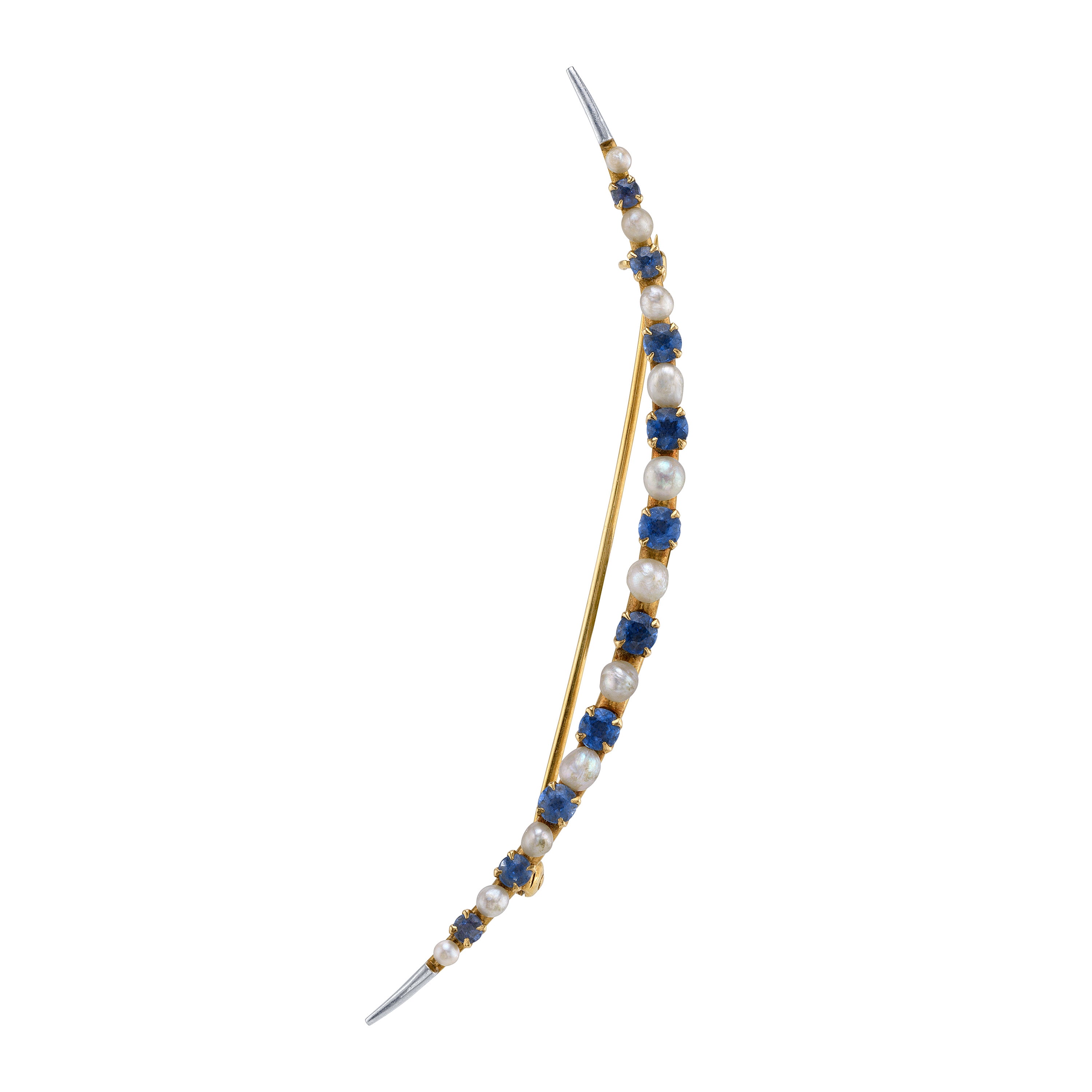 1890s Yellow Gold alternating Seed Pearl and Blue Sapphire brooch set in 14k yellow gold. Hallmarked "Bippart, Griscon, & Osborn".