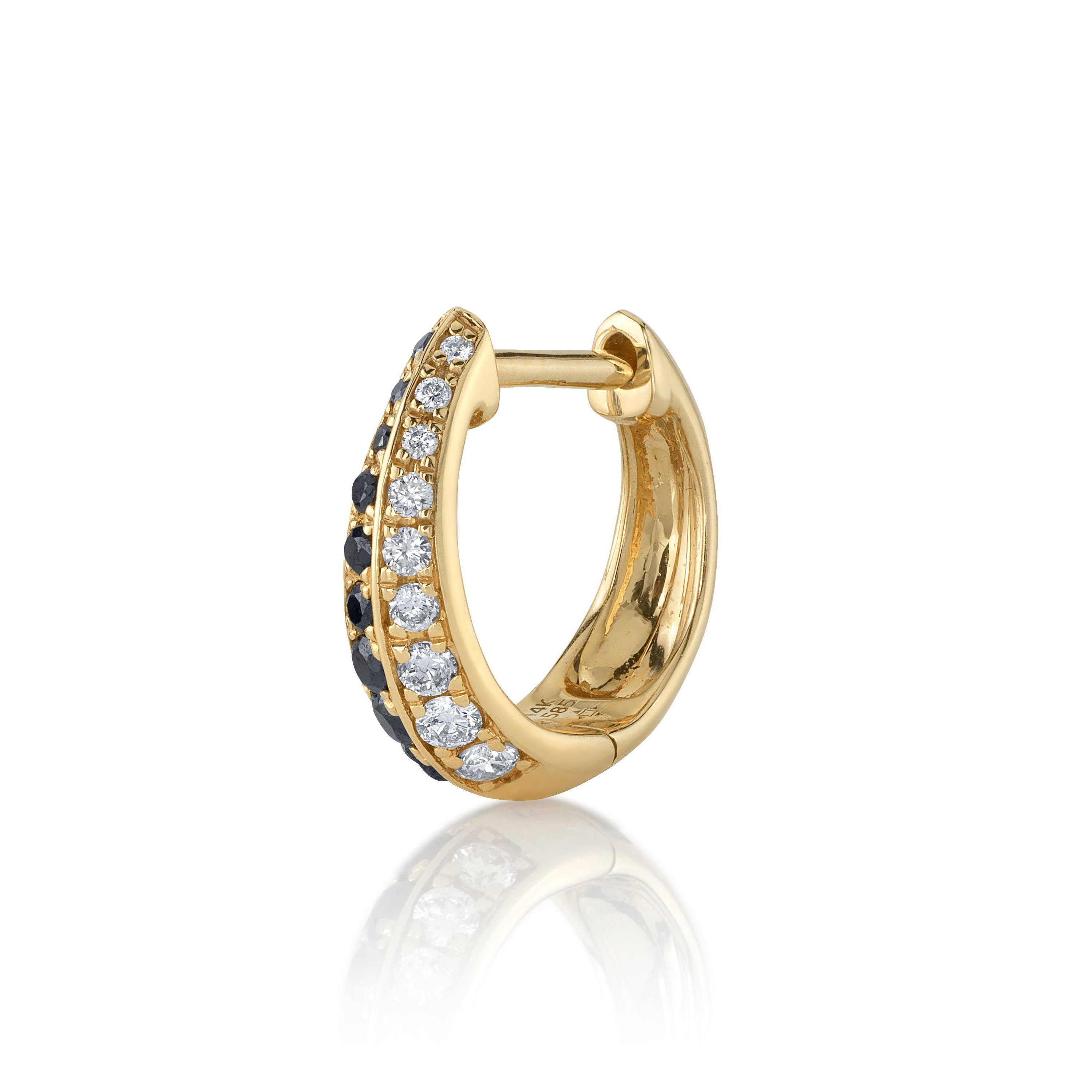 Upgrade your earring game with these huggies. They are a playful twist on a classic design. Sparkling in black and white diamonds, these huggies add a touch of glamor to any outfit. Huggie: 10mm.