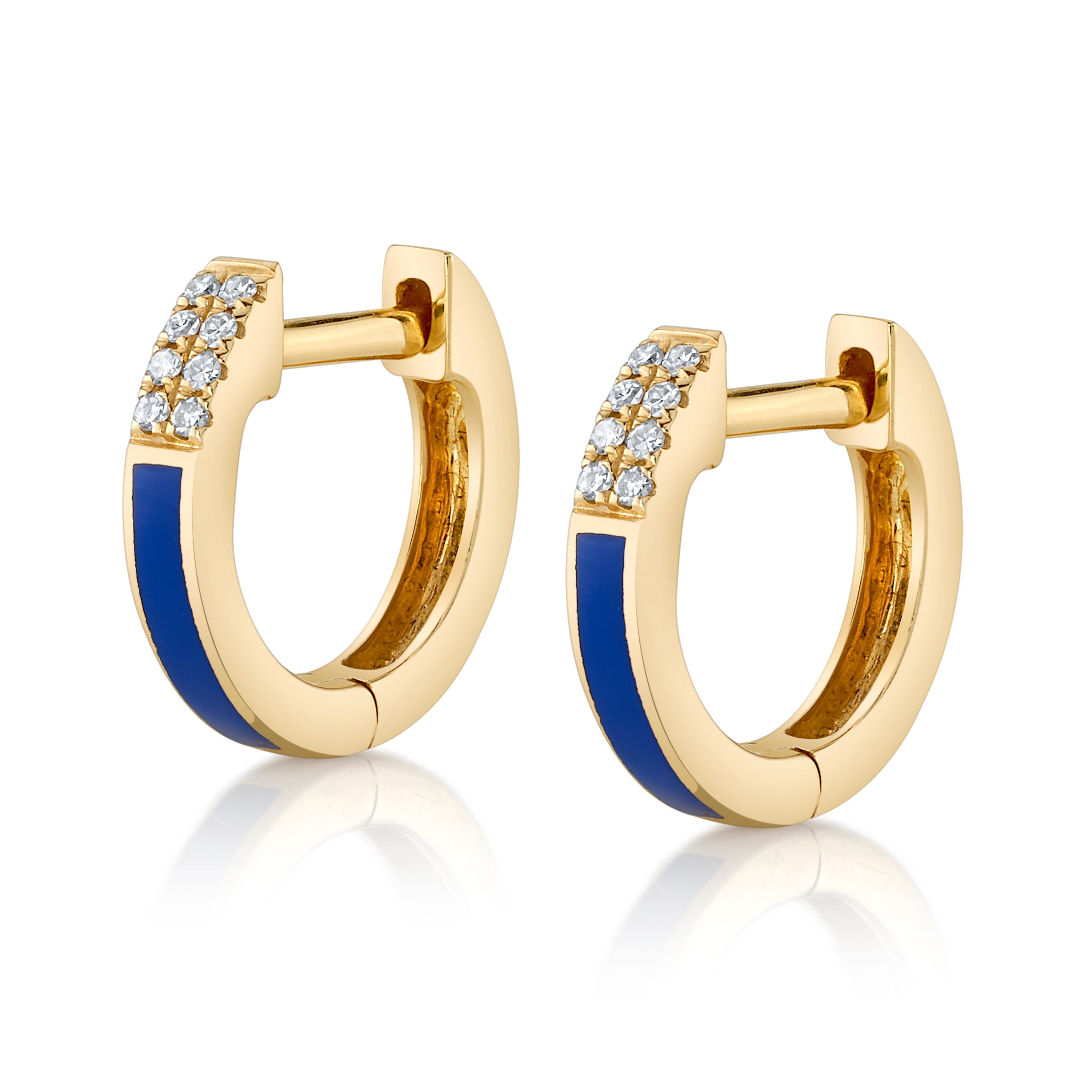 Huggie set in 14k gold with blue or turquoise enamel along the body and eight white diamonds featured at the top.
