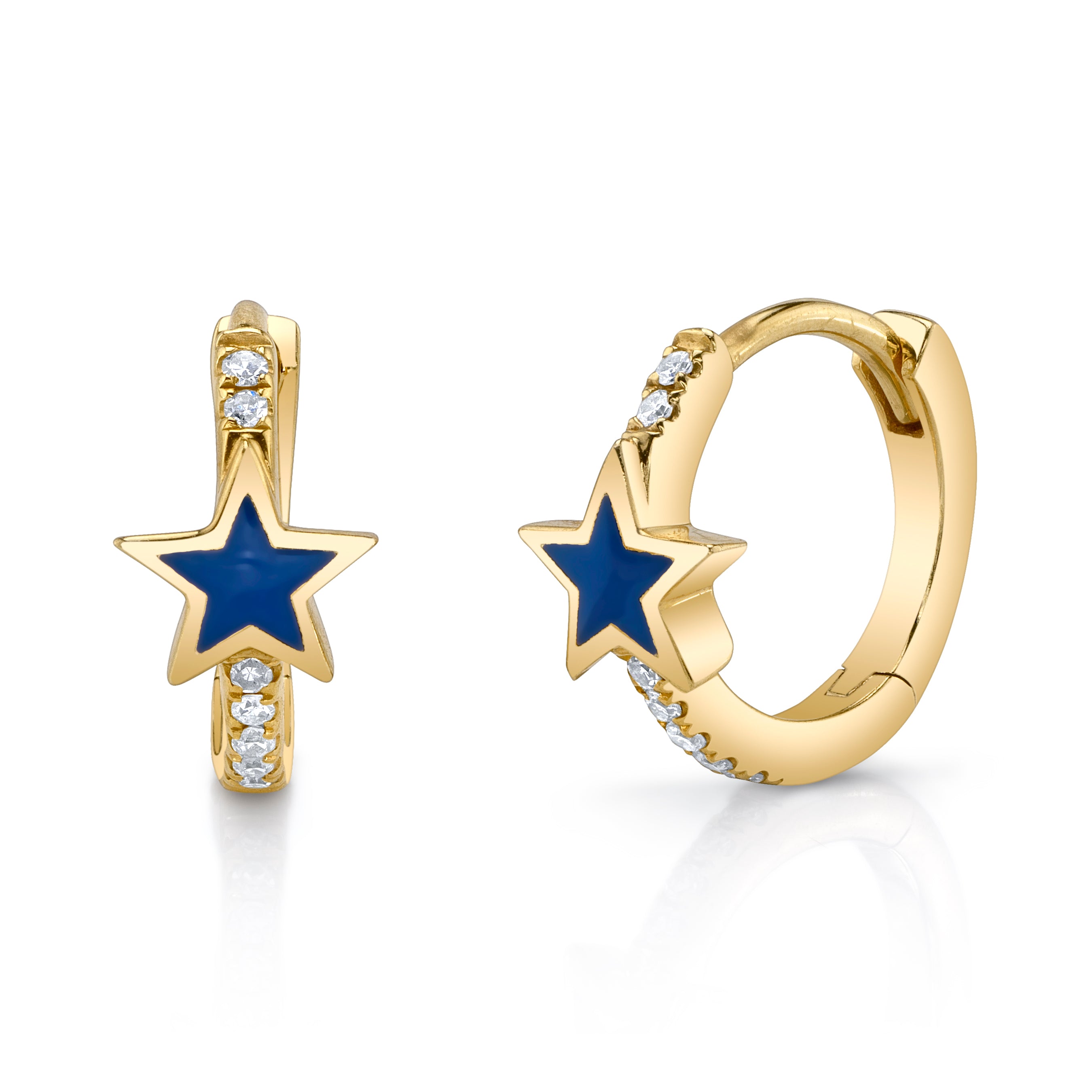 This huggie is made with blue enamel and diamonds, adding a touch of color and sparkle to any outfit. Crafted in 14k yellow gold.