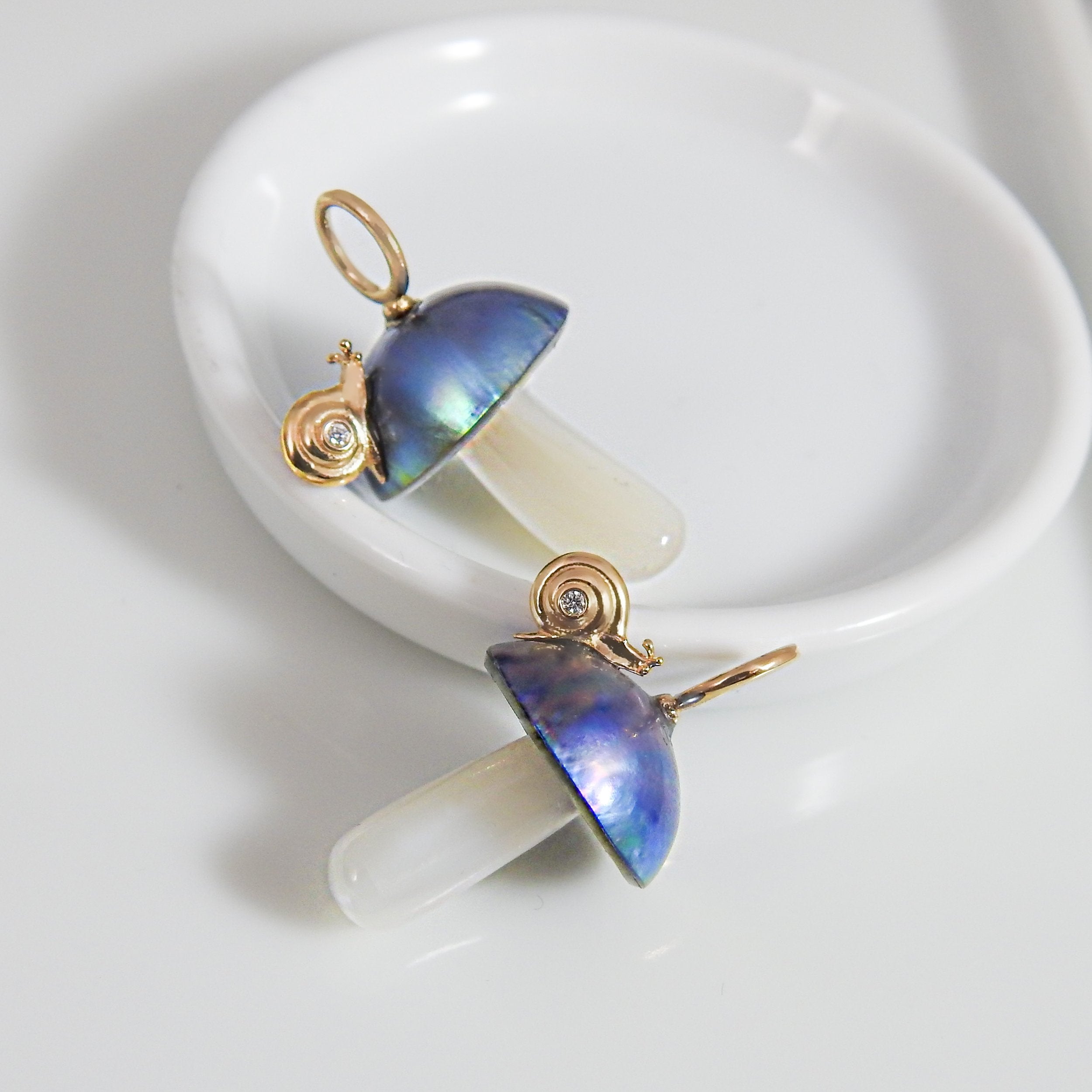 A 14k Solid Gold Snail with two flush set diamonds sits perched happily atop a hand carved mushroom. The mushroom top is Blue Mabe Pearl with an abalone underside, and the stem is Mother of Pearl. Charm: 25mm x 18mm.
