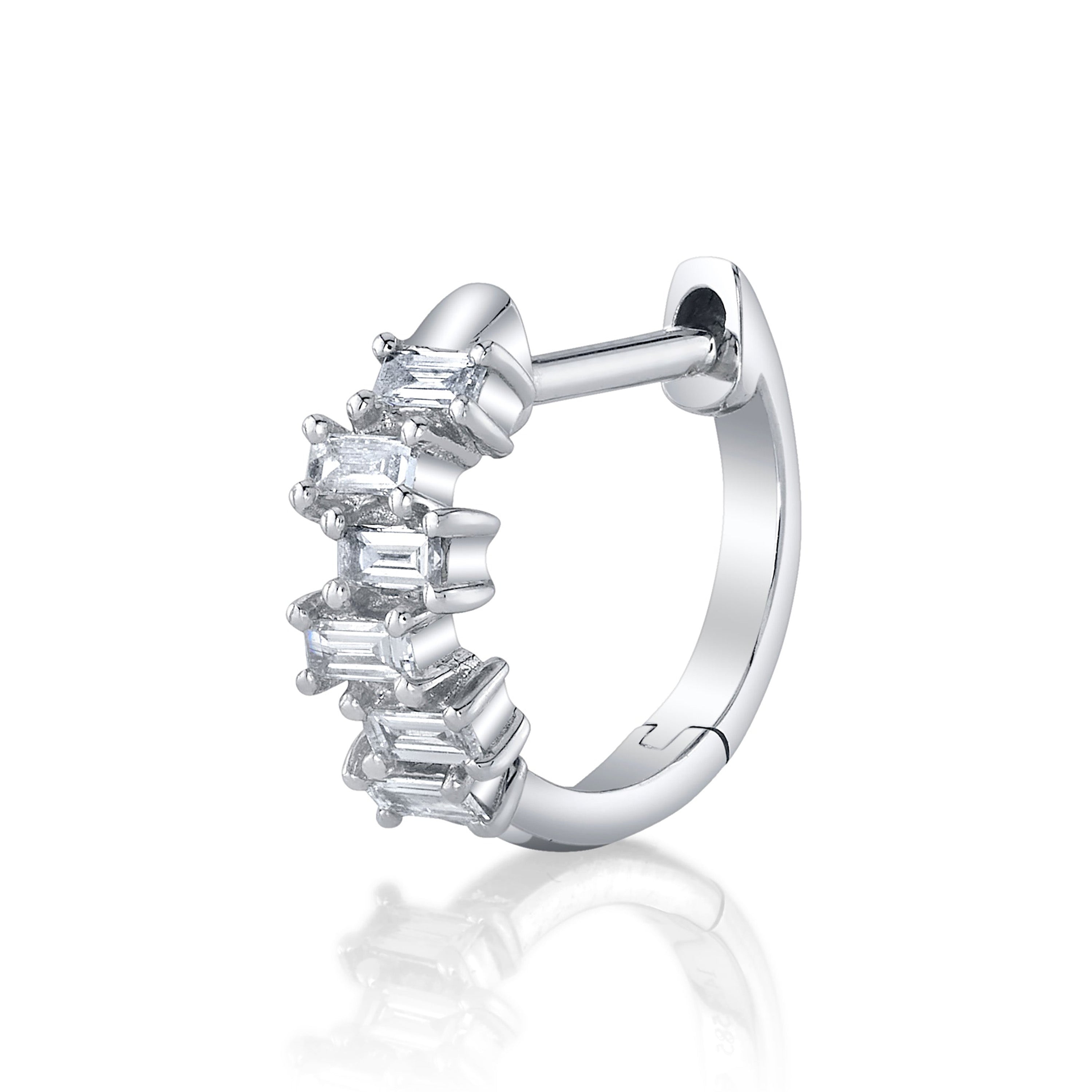 This stunning earring hugs the ear perfectly. Five baguette stones are prong set in a running brick style pattern that emphasize the beauty.
