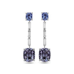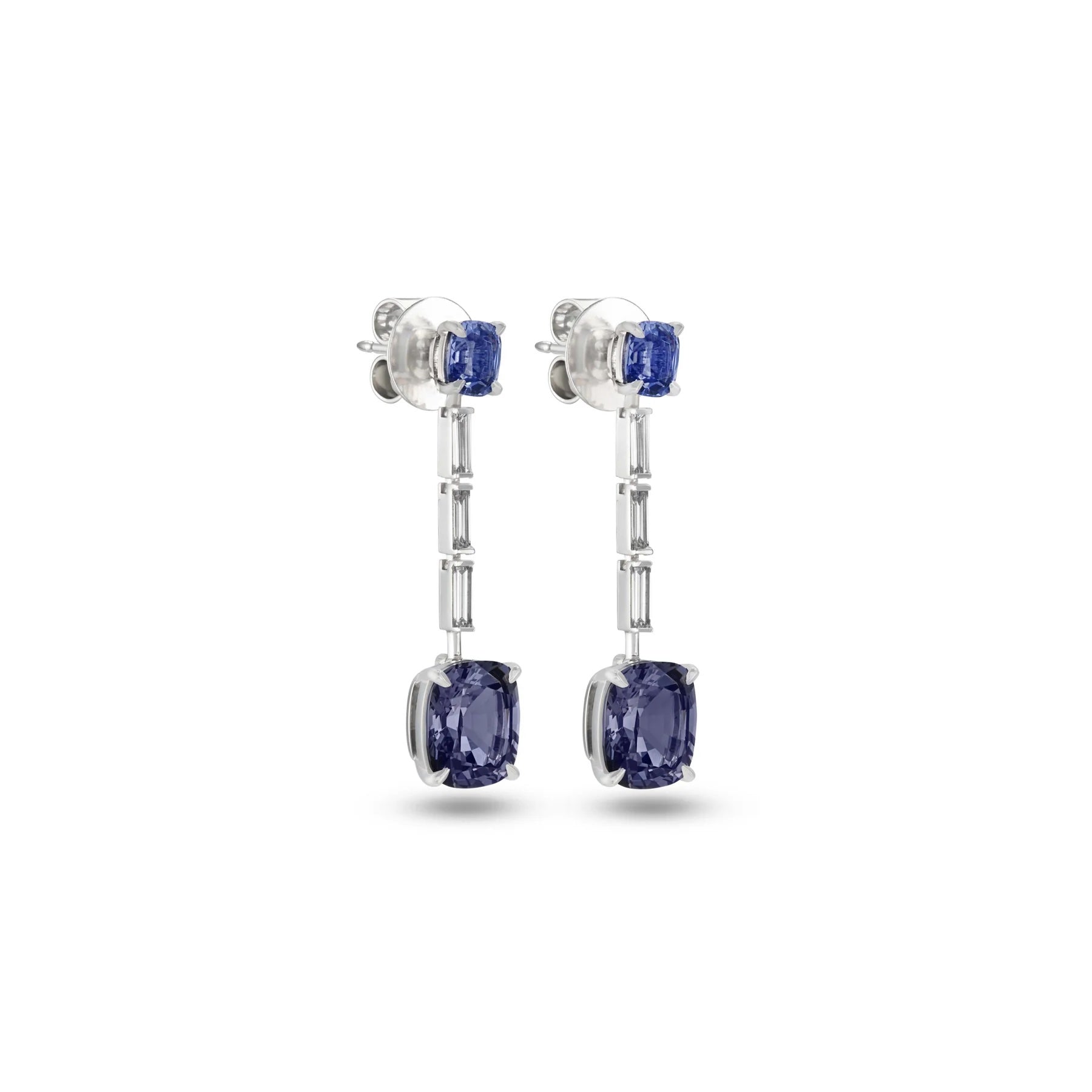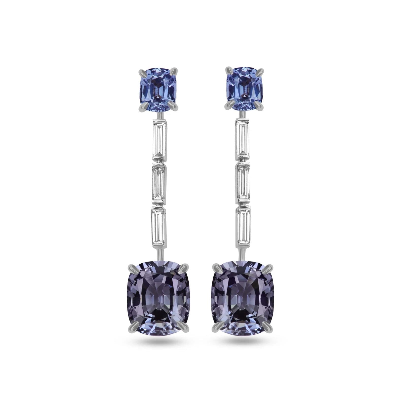 Burmese Spinel and Diamond earrings, set in 18k White Gold. Earring pair features 1.40ct bluish-gray Burmese Spinel and 6.54ct violet-gray Burmese Spinel and .46ct F VS baguette-cut Diamonds. Sold as a pair.