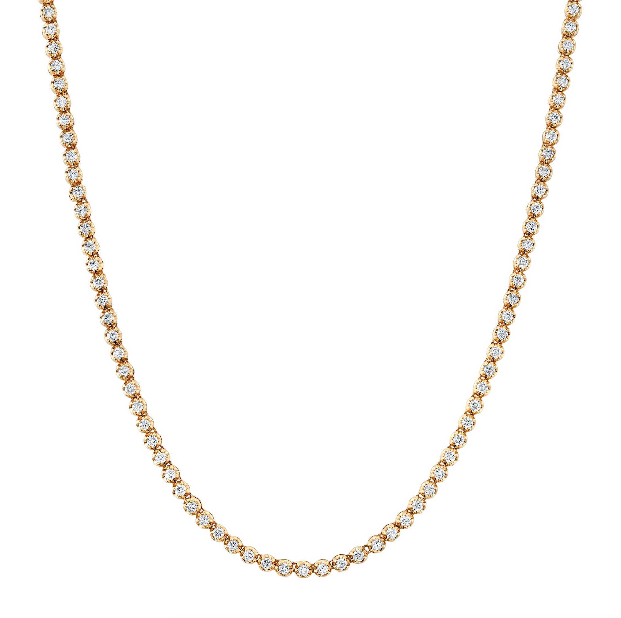 This classic style tennis necklace features 3.38ct beautiful round diamond stones set in hand folded bezels. The 18 inch length necklace has an open box clasp for extra security. It is timeless and the perfect addition to any outfit.