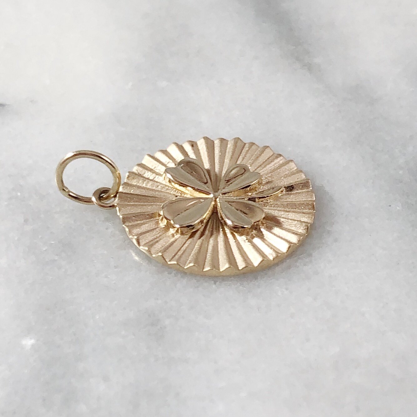 Radiate luck with this multidimensional "Good Luck" clover medallion buffed to a high shine. Expertly crafted in New York City in 4.1grams of solid gold. Charm: 20mm (without the Bale).