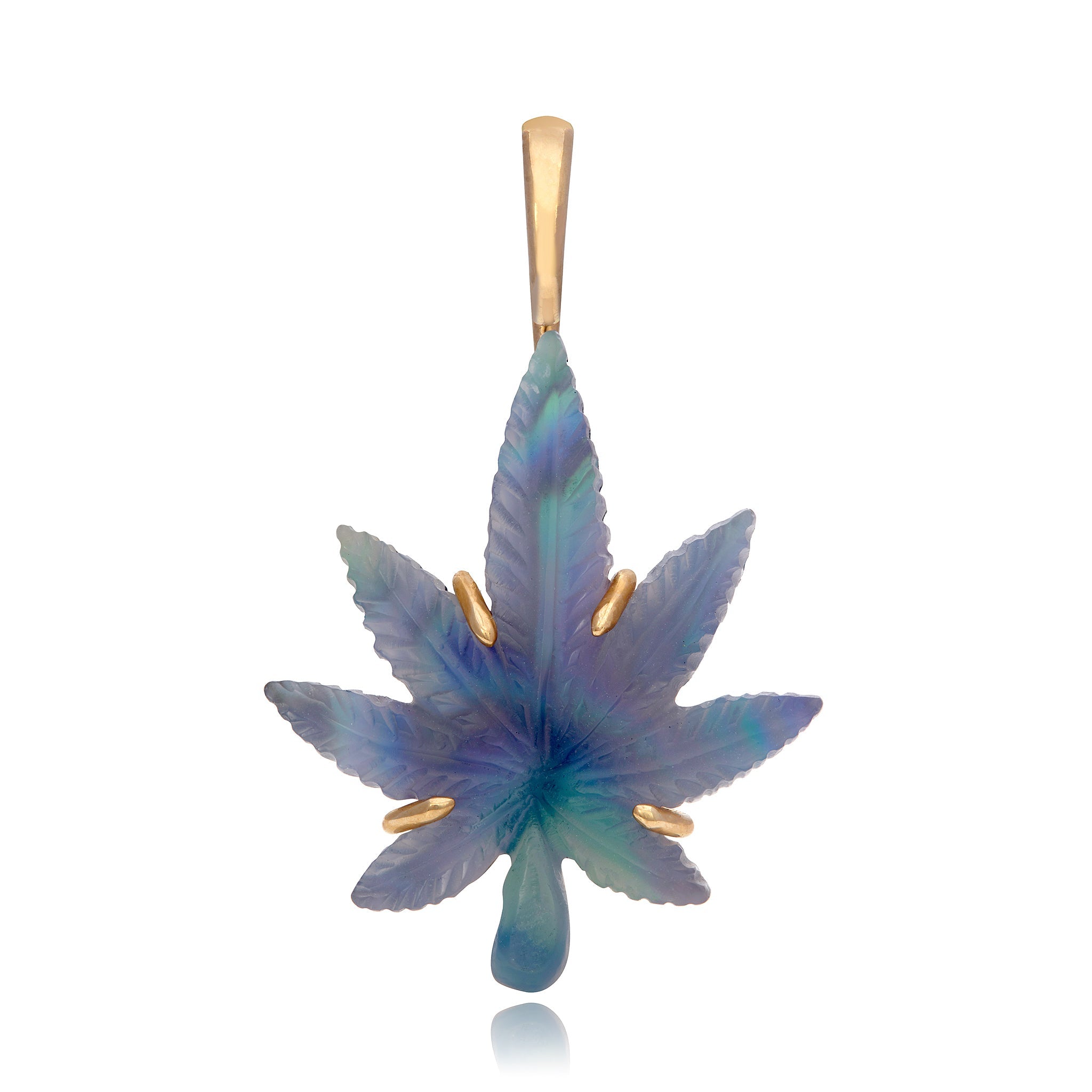 This unique "Mary Madness" leaf charm is carved and layered with a thin shape of abalone beneath hand carved milky clear chalcedony. Natural abalone shell has complex layers of patterns and colors in its nacre.