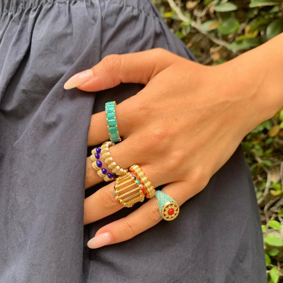 Experience the undeniable beauty of this ring. Meticulously crafted with a prong set design, this band showcases stunning turquoise or lapis stones. Available in size 8.