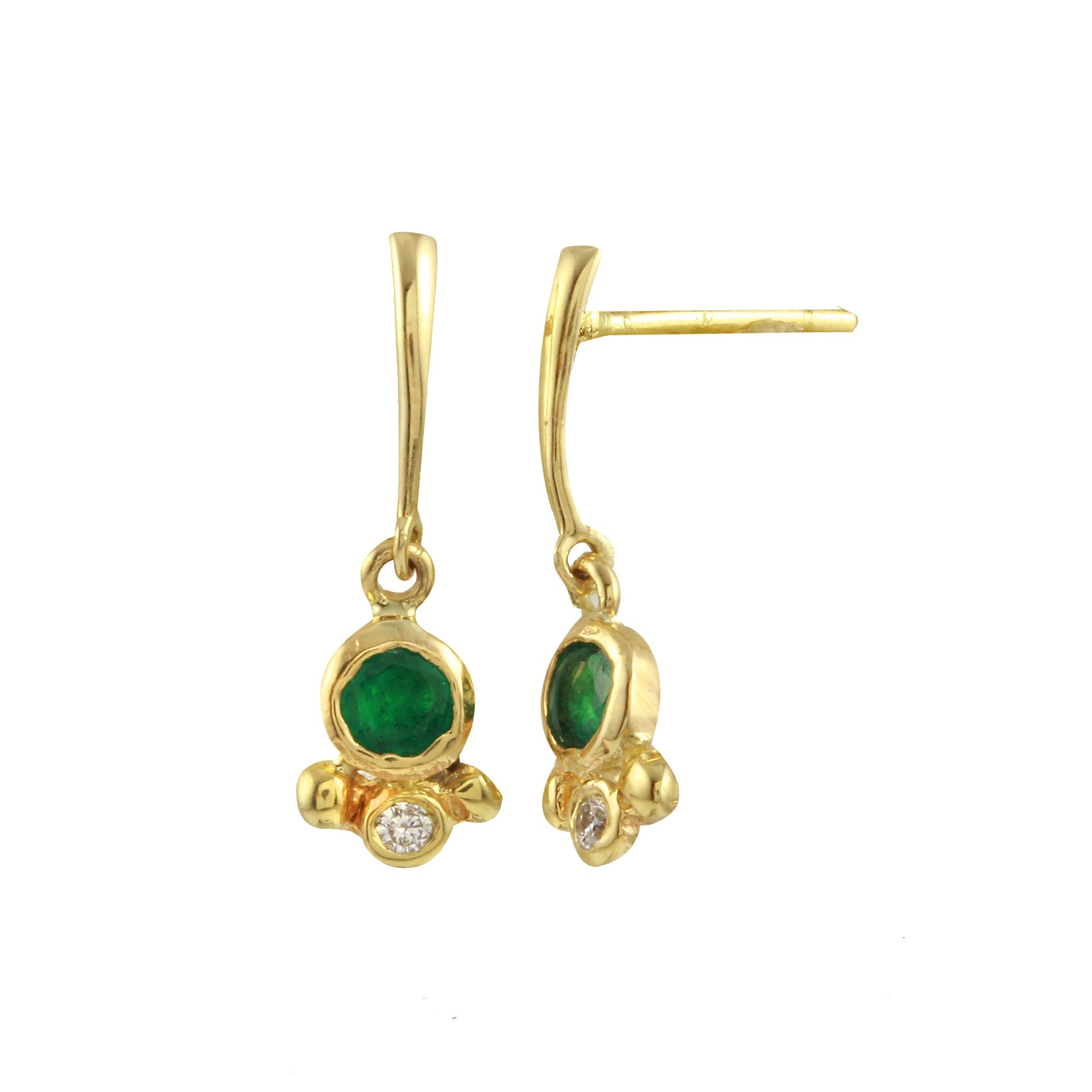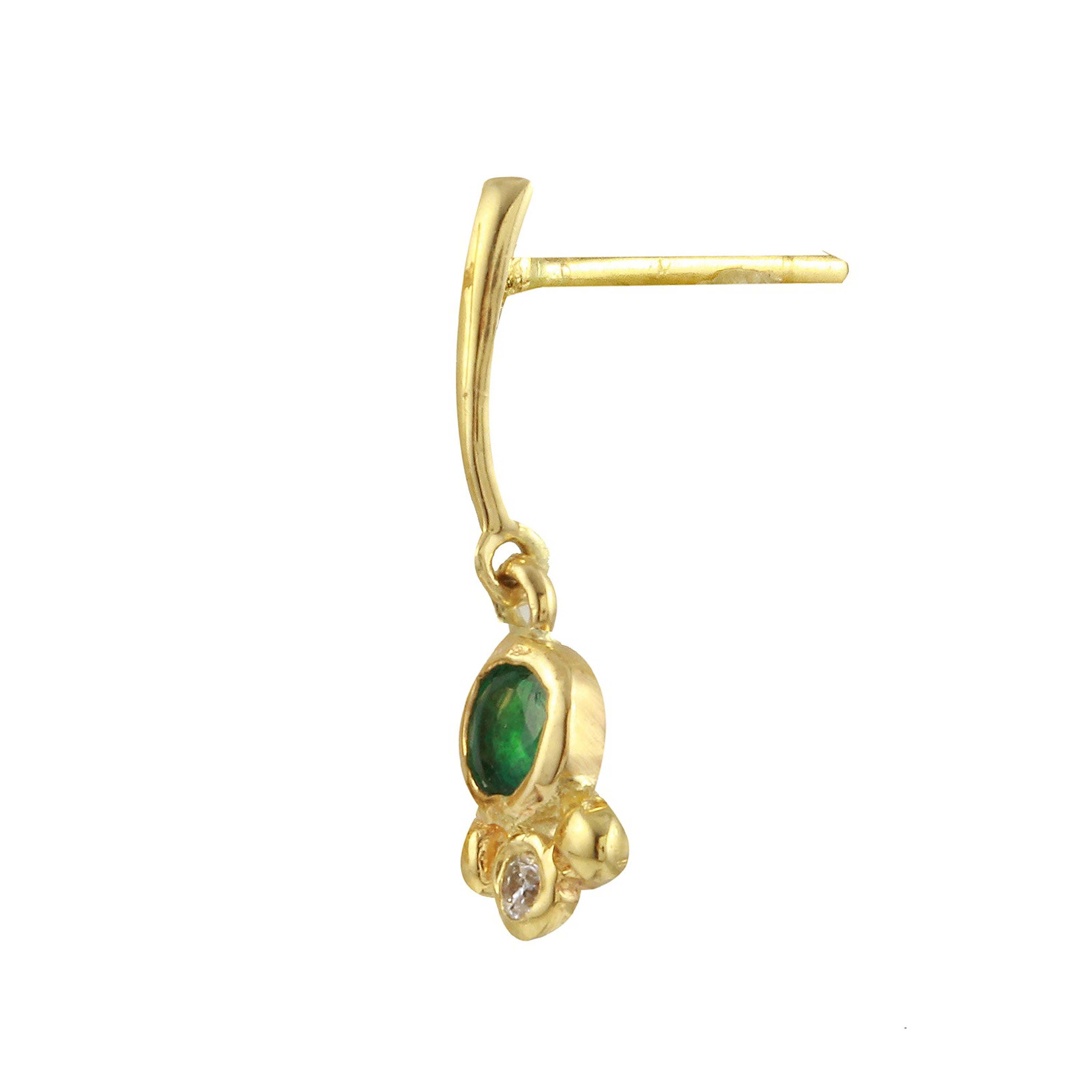Add some sparkle to your look with this dangle stud. A colorful and unique addition to any outfit! 1.5 centimeter length with a 3mm Emerald and Diamond Bezel with gold line, set in 14k Gold.