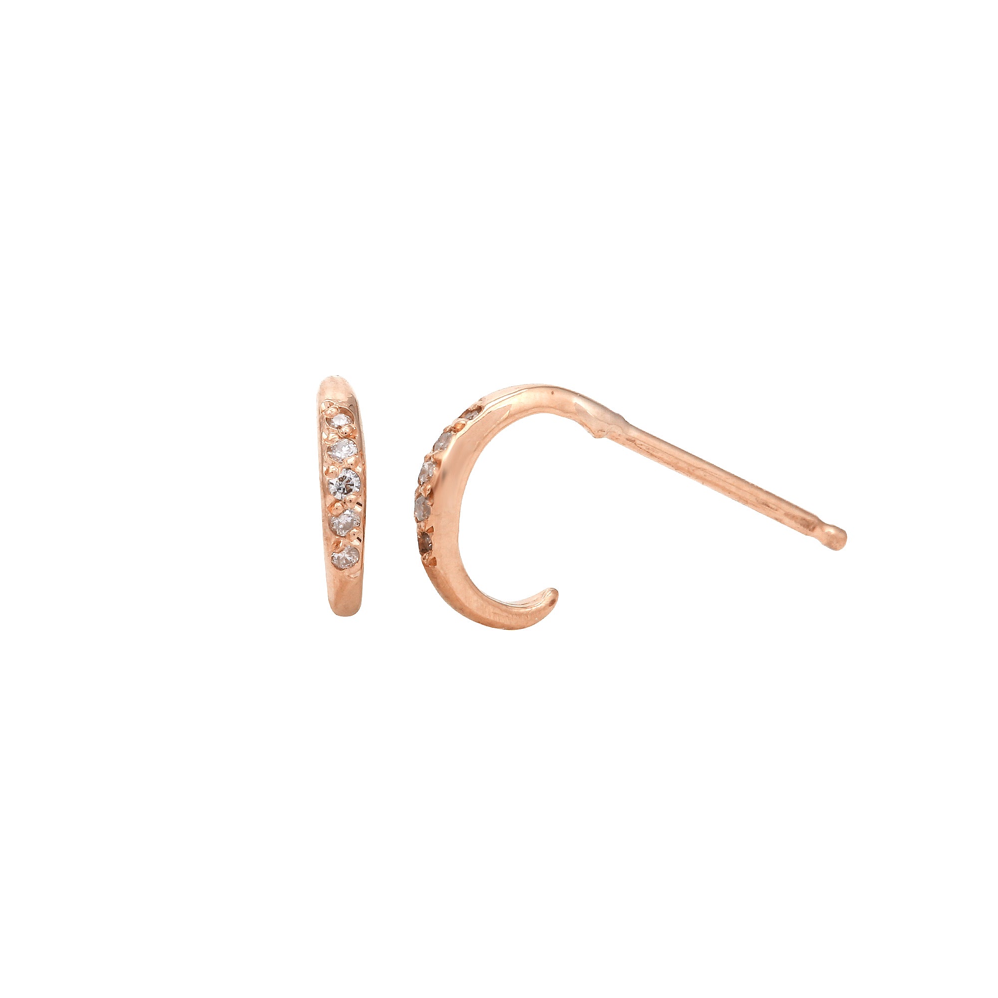 14k gold half hoop stud with diamond pave. Sold as a single. Each piece of jewelry is handmade by Jaine in wax and then cast. Due to the handmade quality, no two are completely alike. Recurring themes are nature and simplicity.