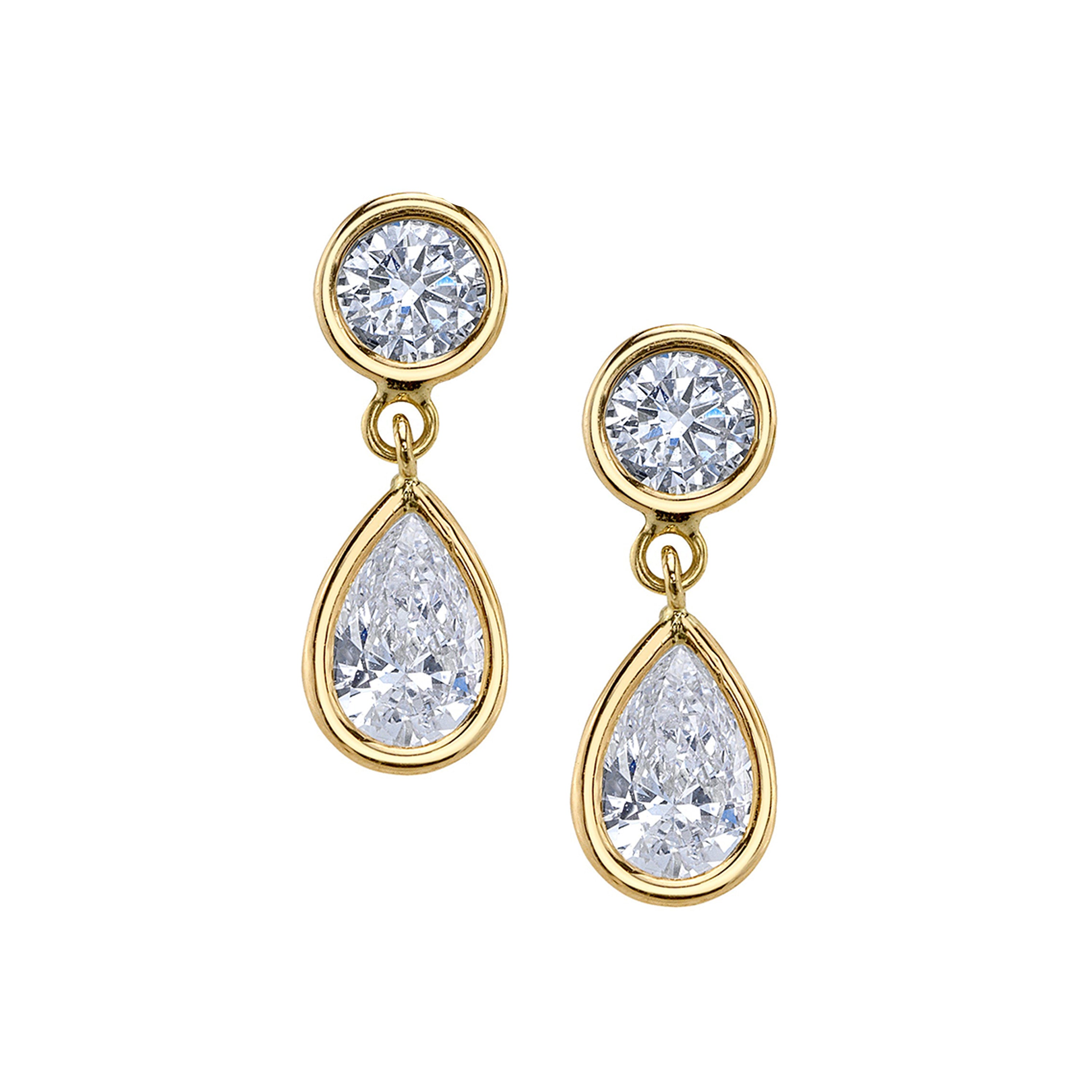 These Beauties feature a 14k Yellow Gold setting with a Round Diamond and Pear shape Diamond Drop. The drop earrings feature .39 cts round diamonds, over .63ct pear-shaped white diamonds. Sold as a pair.