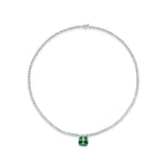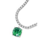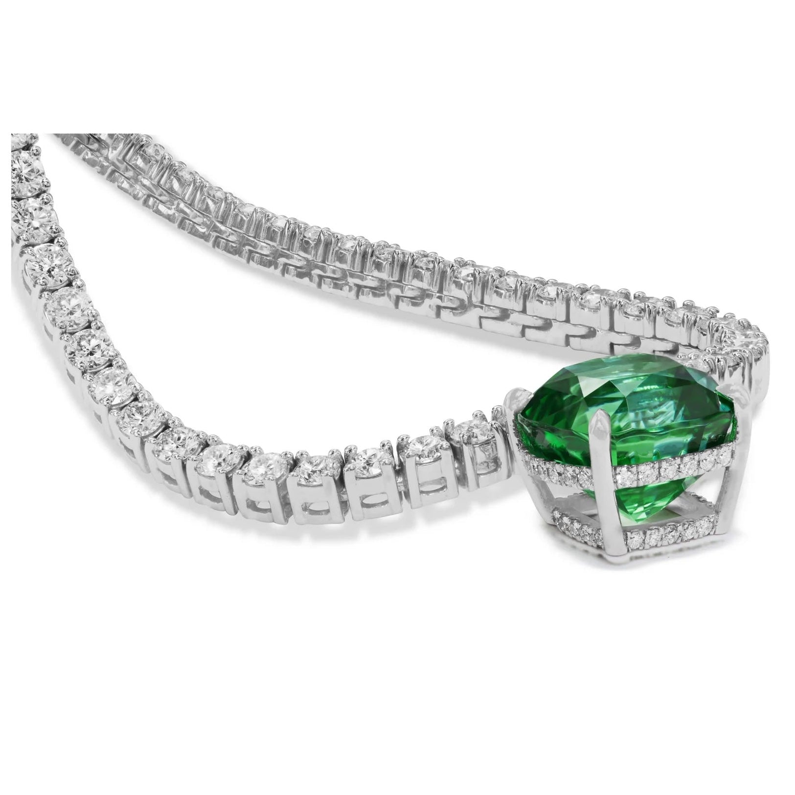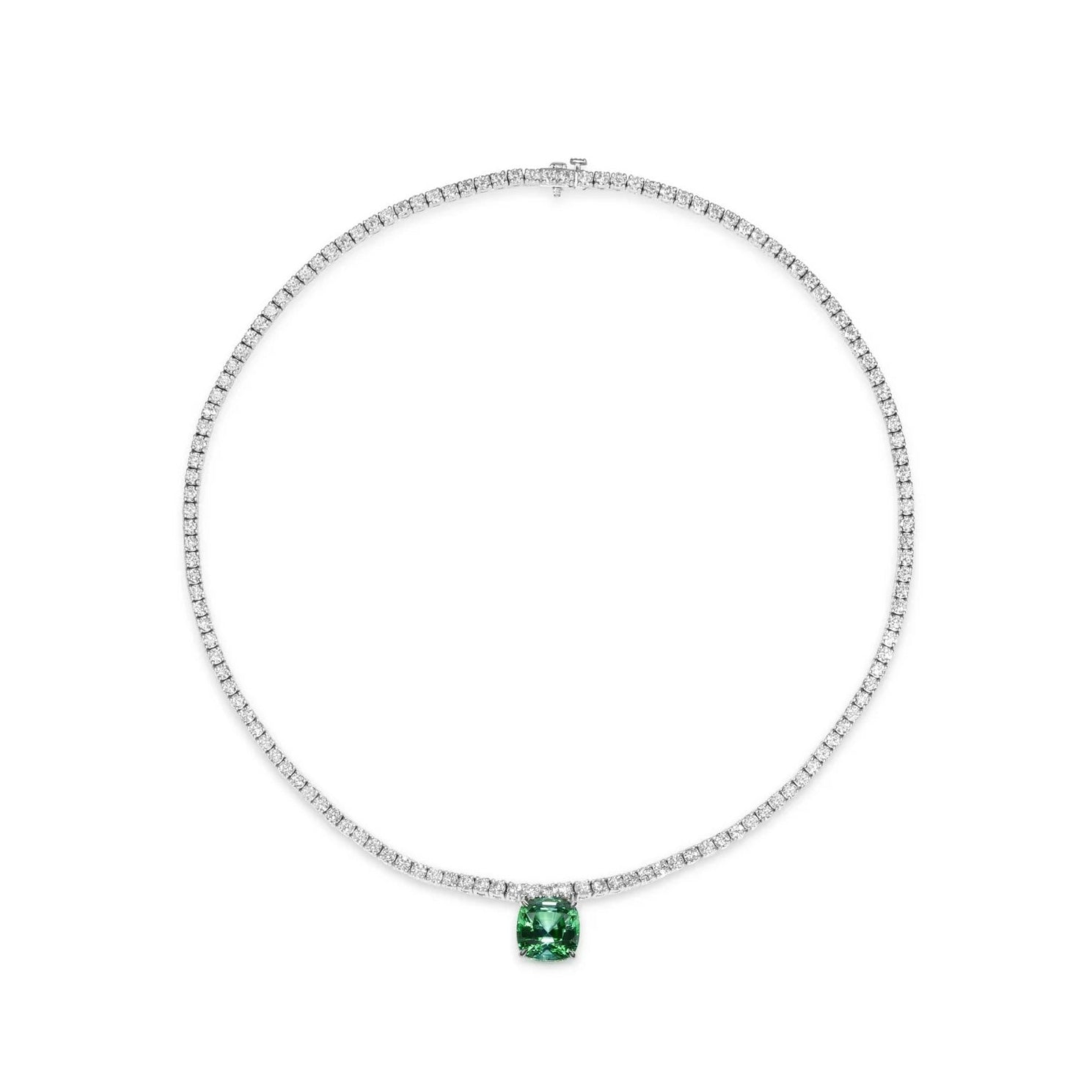 Our signature Taylor necklace combines effortless elegance and versatility. Wear it on its own or attach the mint green Tourmaline pendant to elevate your look. Its Diamond base allows the Tourmaline pendant to create a new customization, making it the perfect sustainable accessory for any occasion. Necklace features 8.41ct D-F VS Diamonds, set in 18k White Gold. The removable pendant is a 7.61ct vibrant mint green Tourmaline and .31ct D-F VS Diamonds. Total necklace length 15.5 inches.