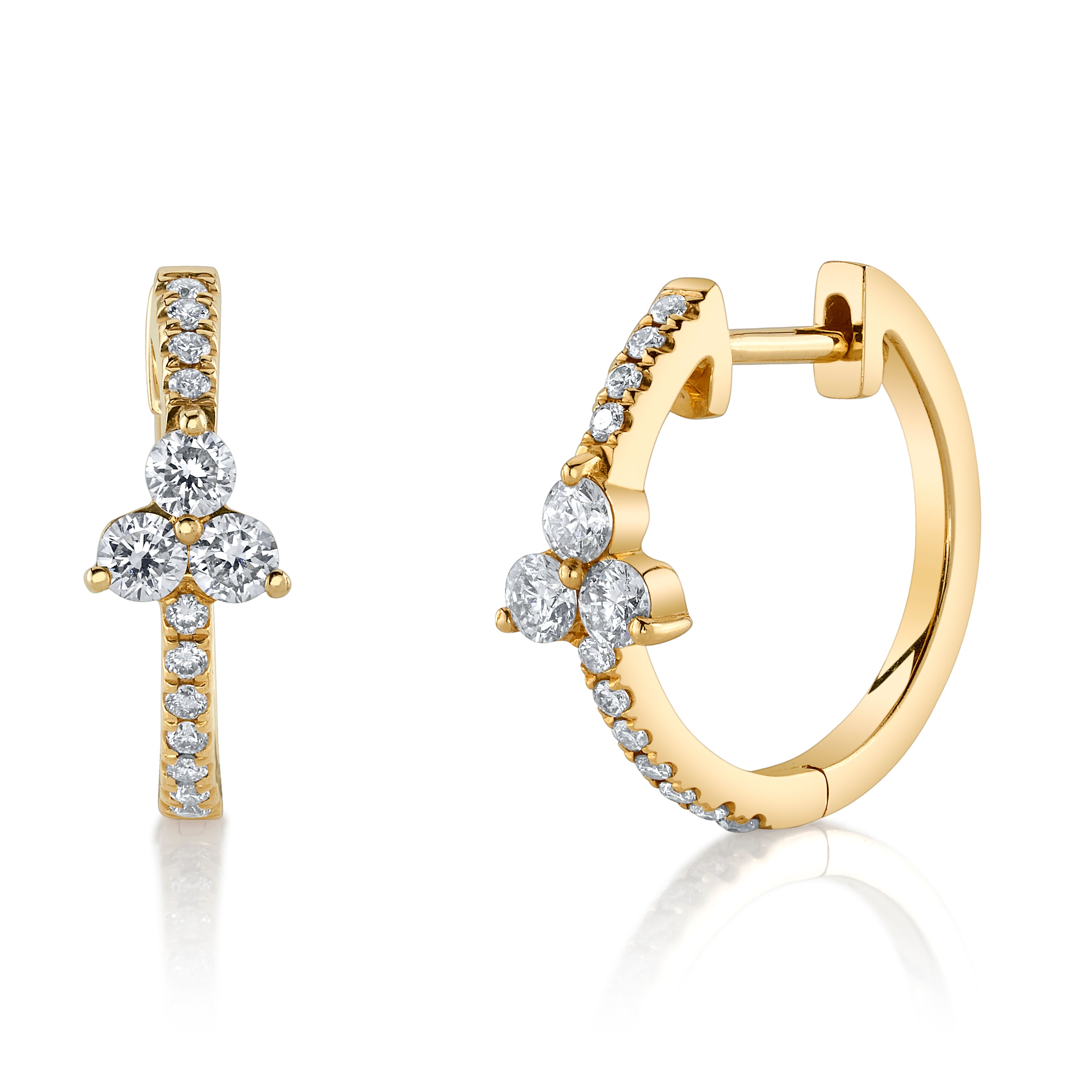 Pave white Diamond huggie with a Trio-Diamond detail at the front. The trio design is bezel and prong-set.