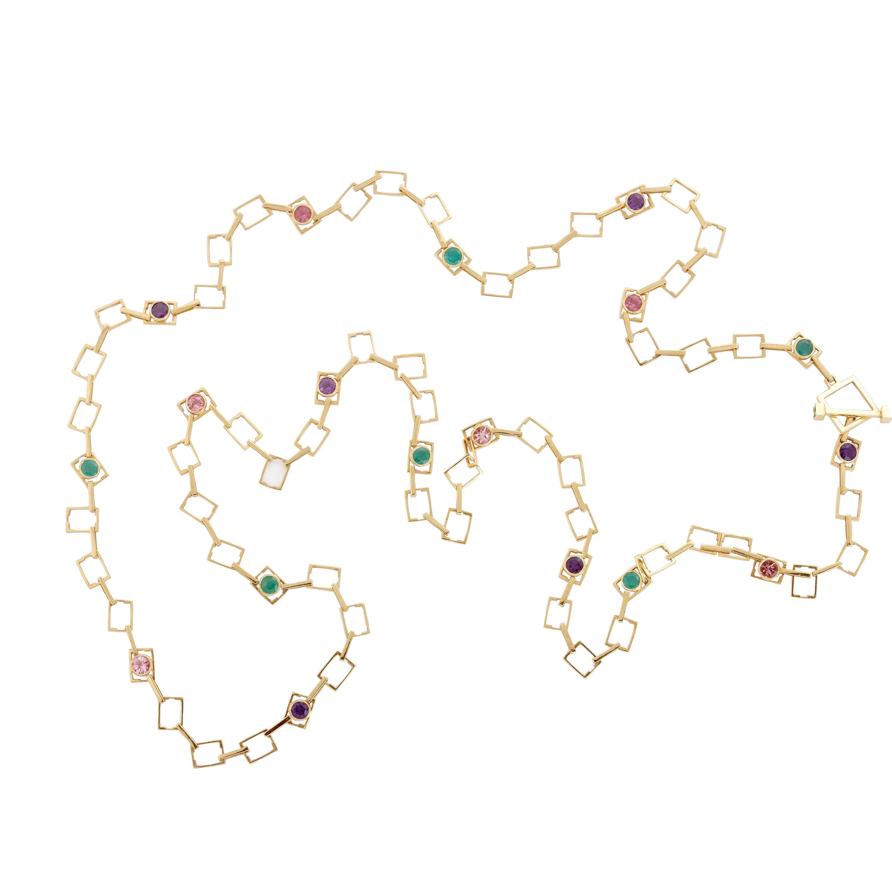 Emerald, Amethyst and Pink Sapphire set in 18k Yellow Gold, with square shapes along the connections. Perfect for layering! Handmade, 40 inches in length. Chain with toggle clasp for easy wear and/or wrapping.