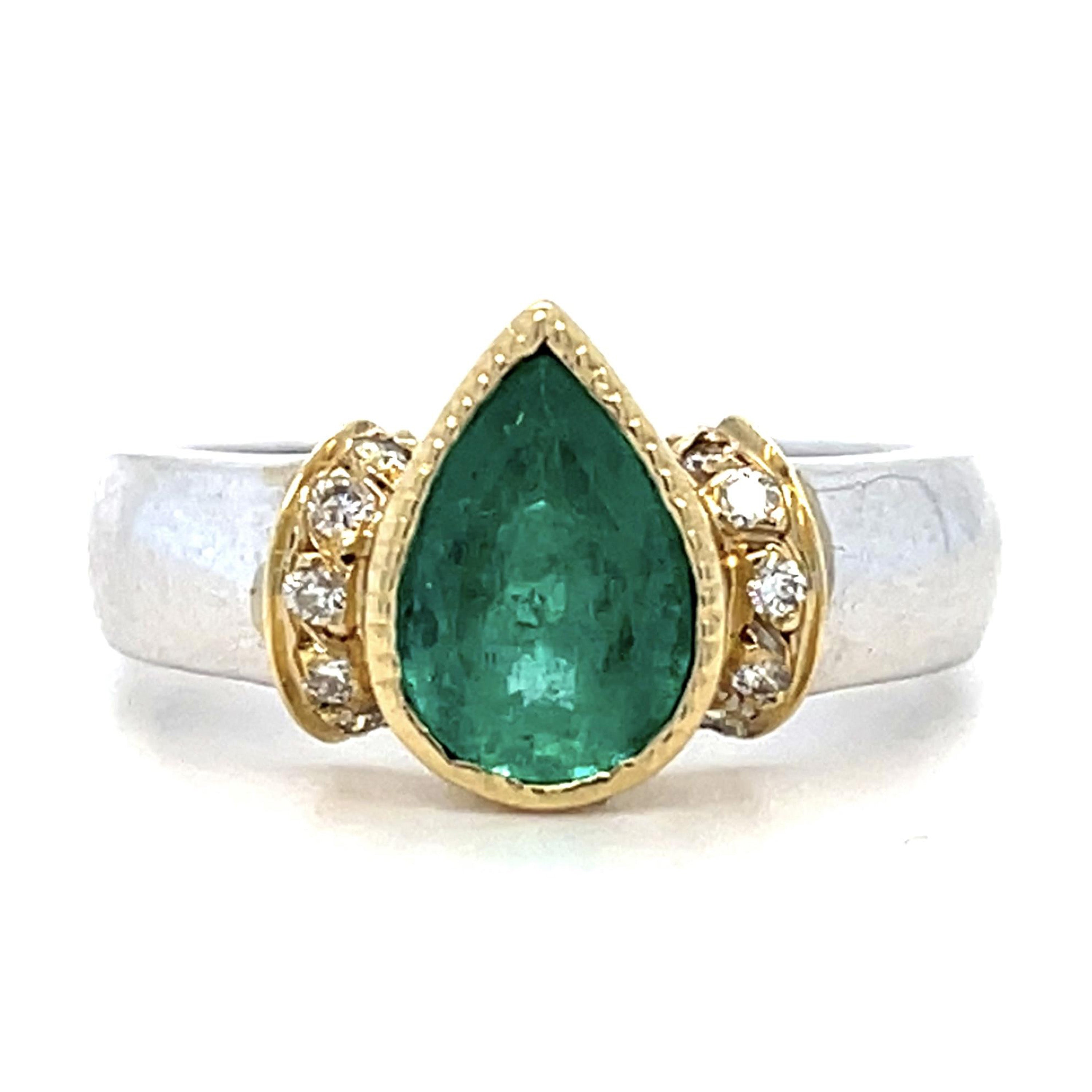Pear-shaped Emerald at 1.45ct with .10ct Diamond, set in two-tone 14k Gold. Available in size 6.