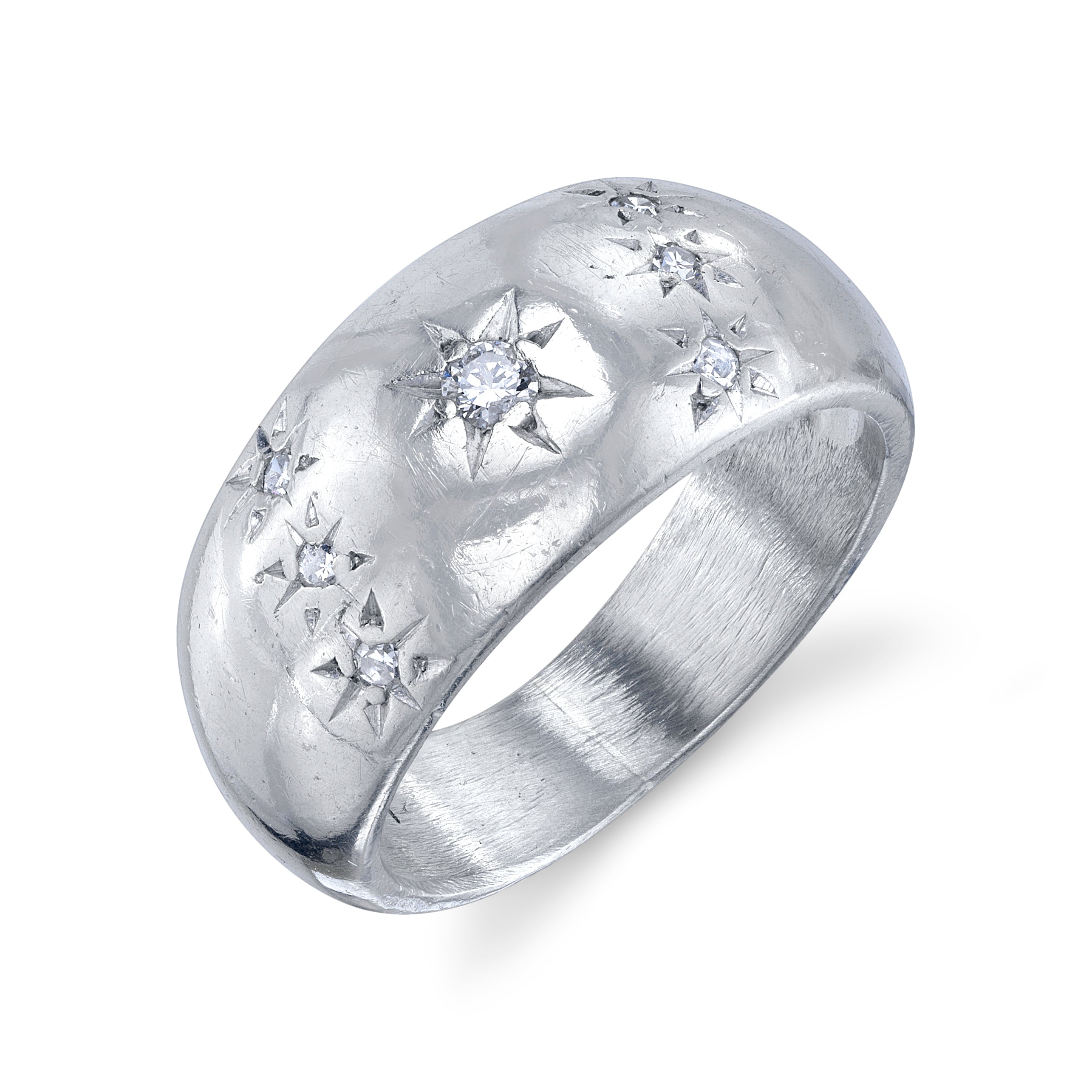 Estate 1930's 14k White Gold Diamond Starburst Cigar Band. Stones are set in carved star-sets throughout the face of the ring. Available in size 4.