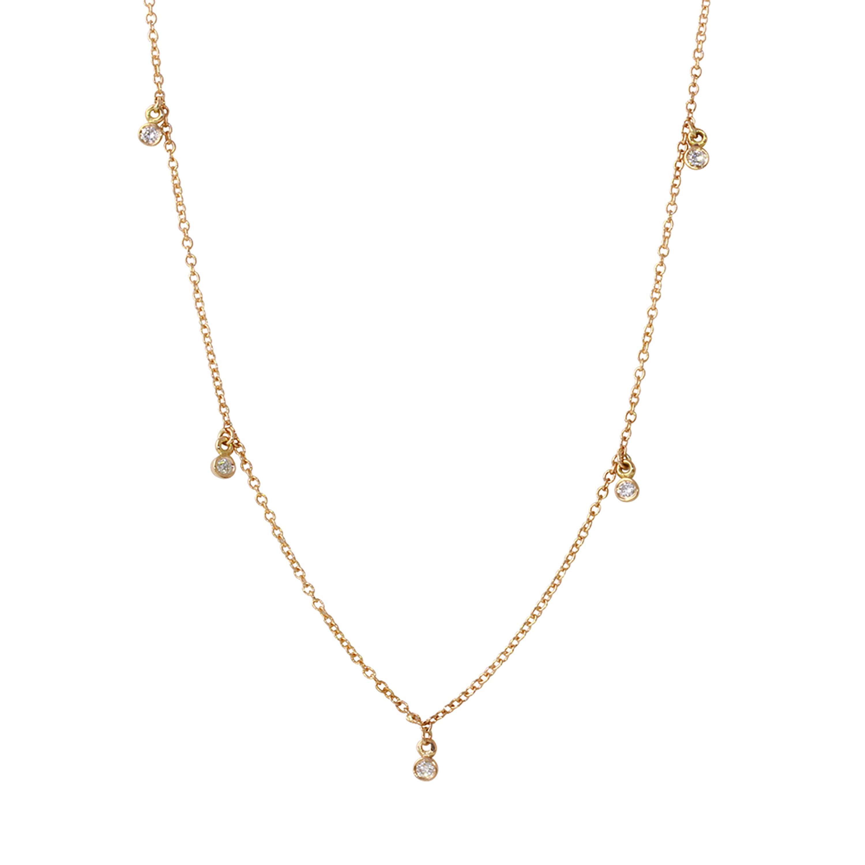 This necklace features five sparkling diamonds, each bezel set for a secure and elegant look. Enhance any outfit with this stunning piece. 1.5 Millimeter Diameter Diamonds. Necklace sits at 14.5 or 15.5 Inch Adjustable Chain.