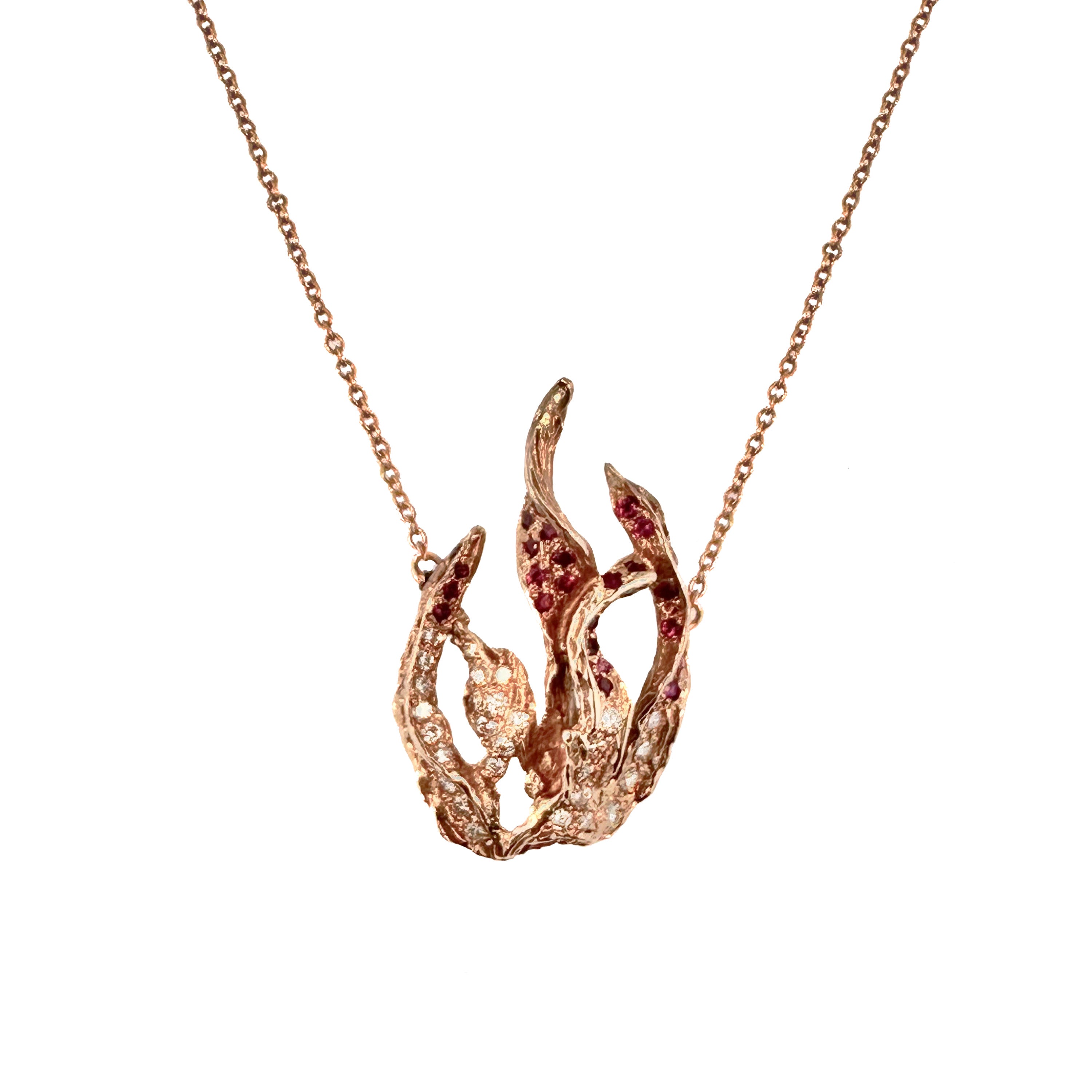 14k yellow flame necklace with pave .50cts Rubies .26ct white Diamonds. Necklace has a lobster clasp closure and measures 16 inches in length.