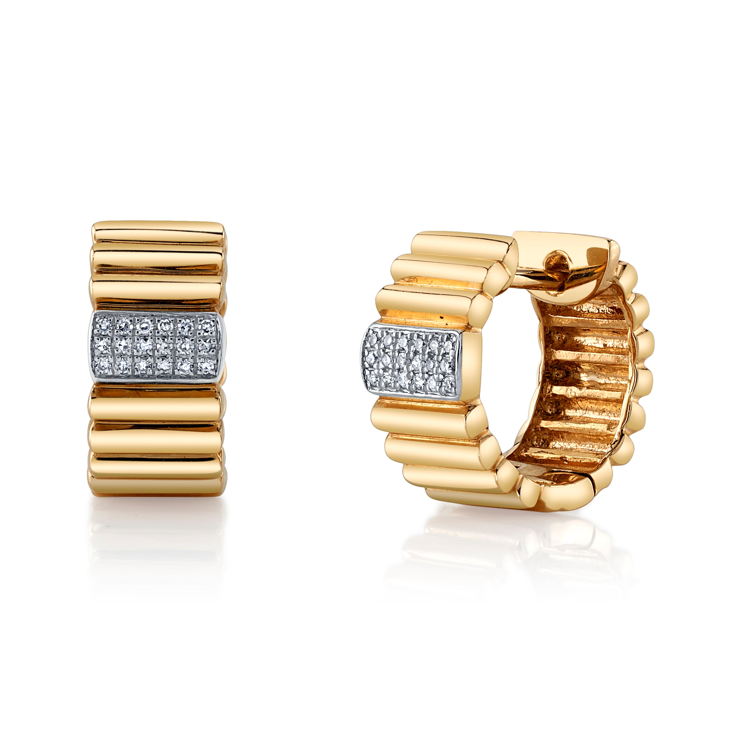 14k Yellow Gold Hoops with three rows of white diamond pave. Approximately 6mm wide with approximately .36ct white diamonds.