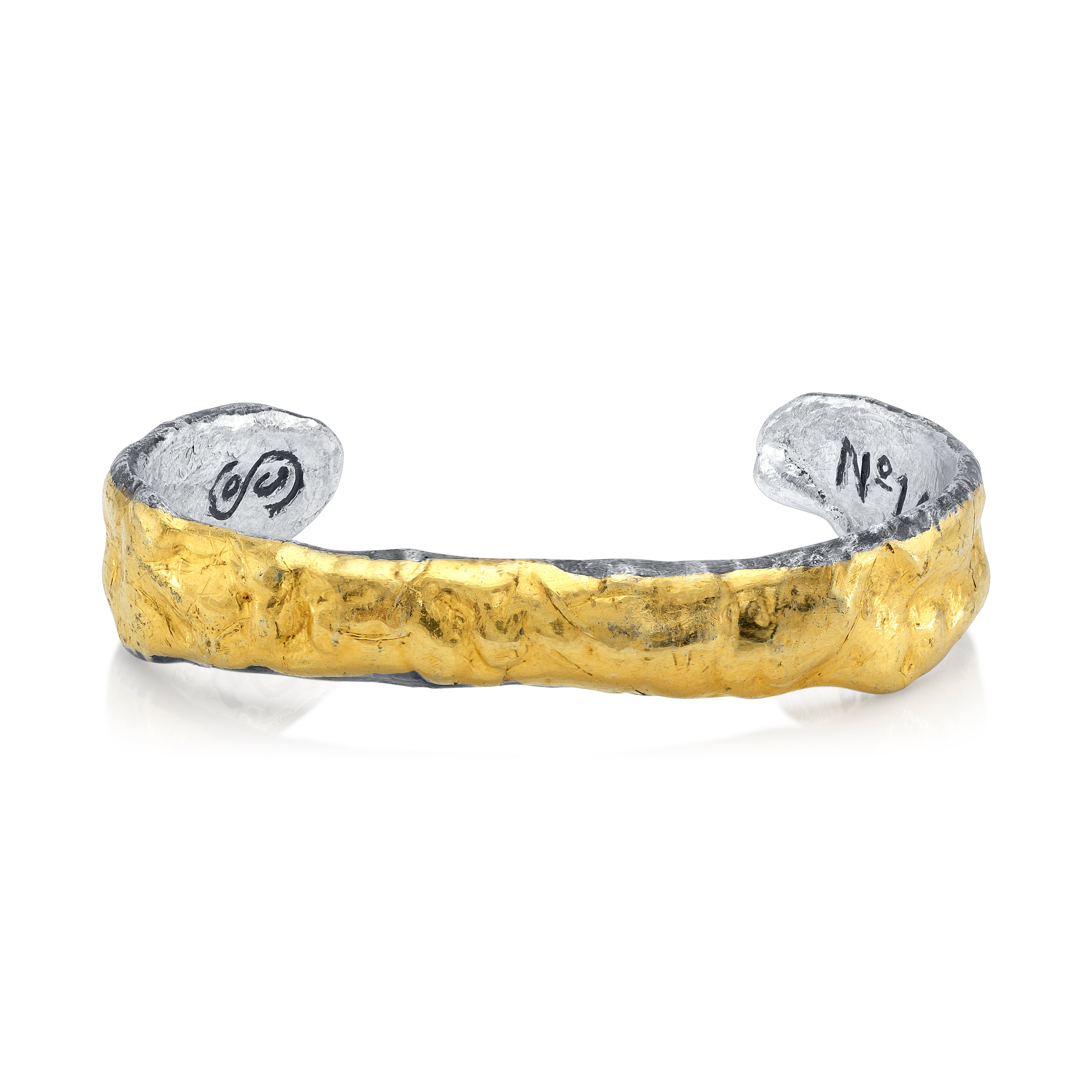 Hand forged and hammered bangle. Bangle is set in 925 Sterling Silver and a 24k Yellow Gold Inlay with Diamond accents.