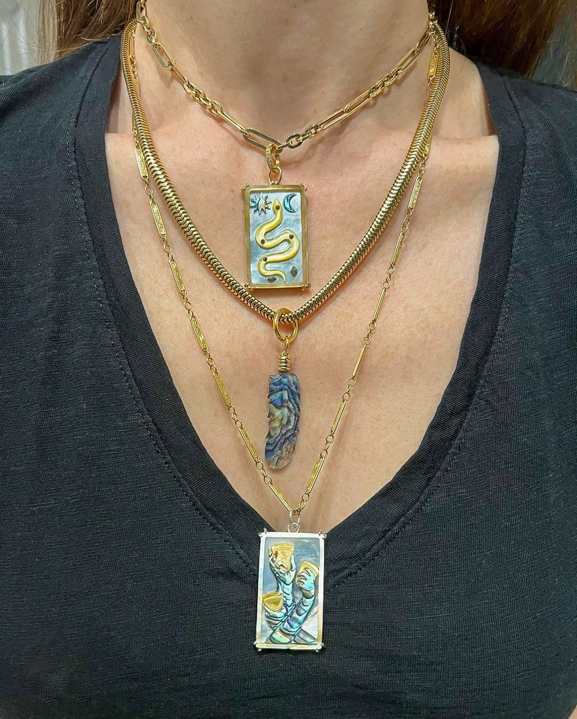 Measurements in Millimeters: Our Tarot Cards and Sacred Symbols are individually hand carved by real people, which means that each tablet is one of a kind. There are natural variations in the colors of the shell as well as the variation by the hand of the artist. The piece you receive will be made out of the materials shown, but may have different color hues and patterns. The Tablets are then hand set by a master setter in New York City in a high polish 14K Yellow Gold basket, which displays an evil eye, a symbol of protection, so the pendant is completely reversible. Measurements in Inches: 1.25” x .75” (35mm x 20mm). Care Instructions: Our hand carved talismans are not intended to be worn in water. Please handle gently and store carefully in a dry place. Chain sold separately.
