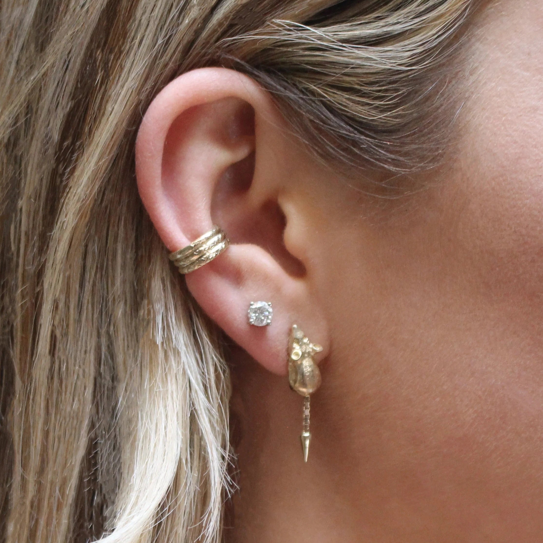 A hardworking mouse is grounded, humble and resilient. The earring is 14k yellow gold. Handcrafted in Los Angeles. Sold as a single.