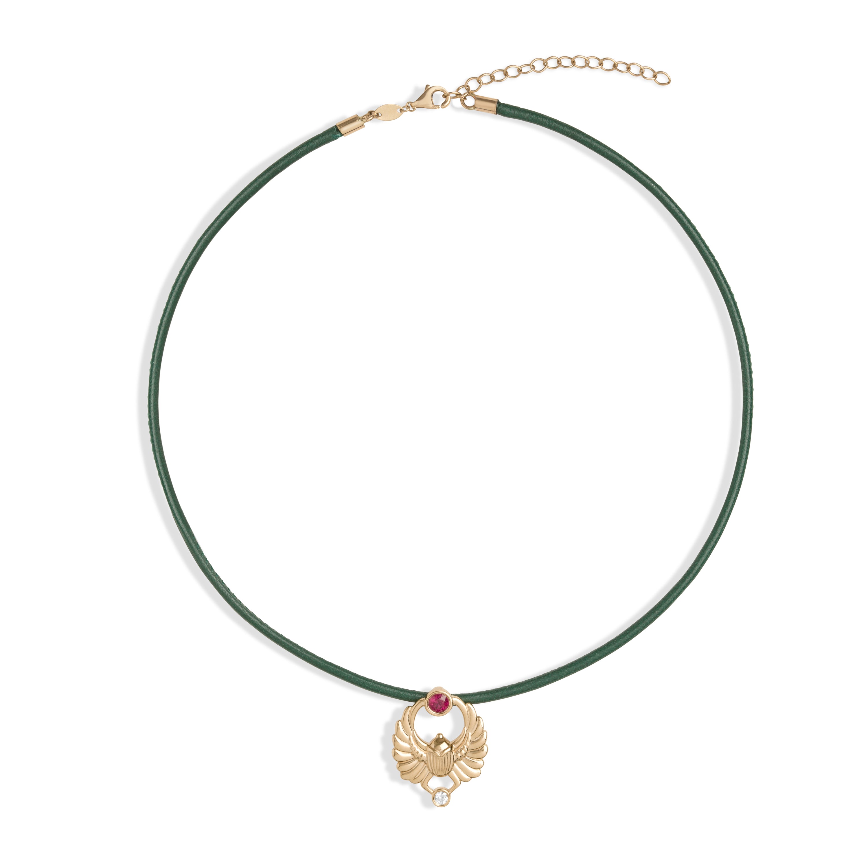 Egyptian scarabs are amongst the most ancient and powerful symbols, traditionally worn as amulets, believed to offer protection and spiritual power. Worn high on the neck as a choker, it layers beautifully and is current in style yet timeless in spirit. Pendant set in 14k Yellow Gold on a green leather cord. Ruby .40ct. White Diamond .10cts. Necklace is 13.25-15.25 adjustable length. Inquire to special order for blue Sapphire stone.