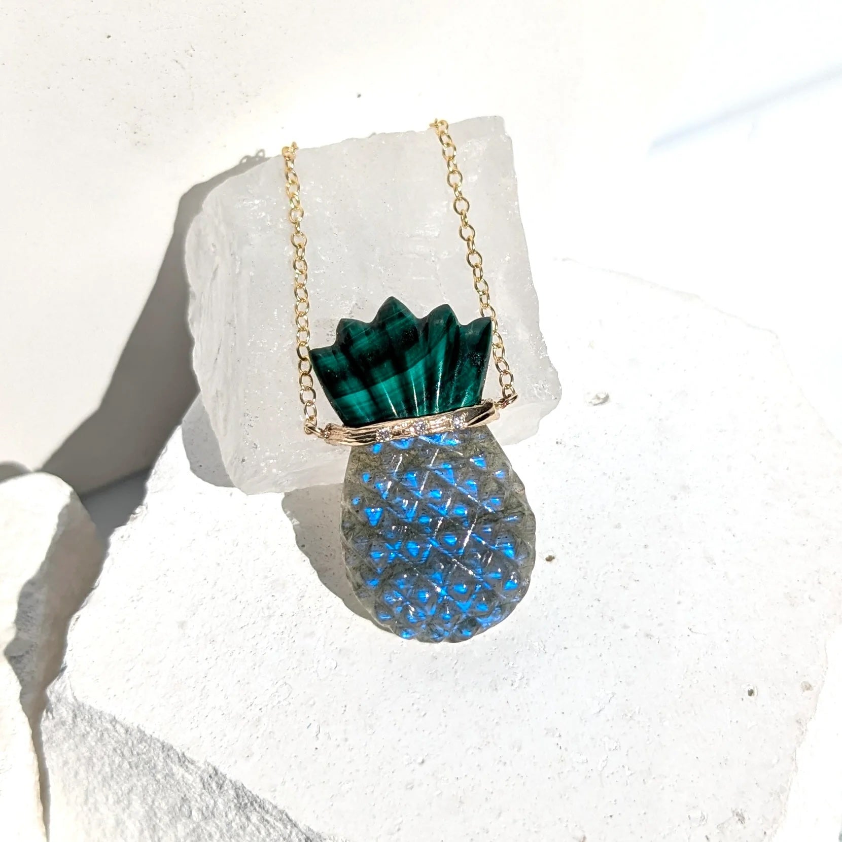 Resort Collection. These whimsical pineapples bring a bit of Aloha to your vacation jewelry stack. Carved completely by hand they are available in Labradorite / Malachite and Lemon Quartz / Malachite. Set with a Diamond willow branch. Necklace is 18 inches in length with a 22mm charm.