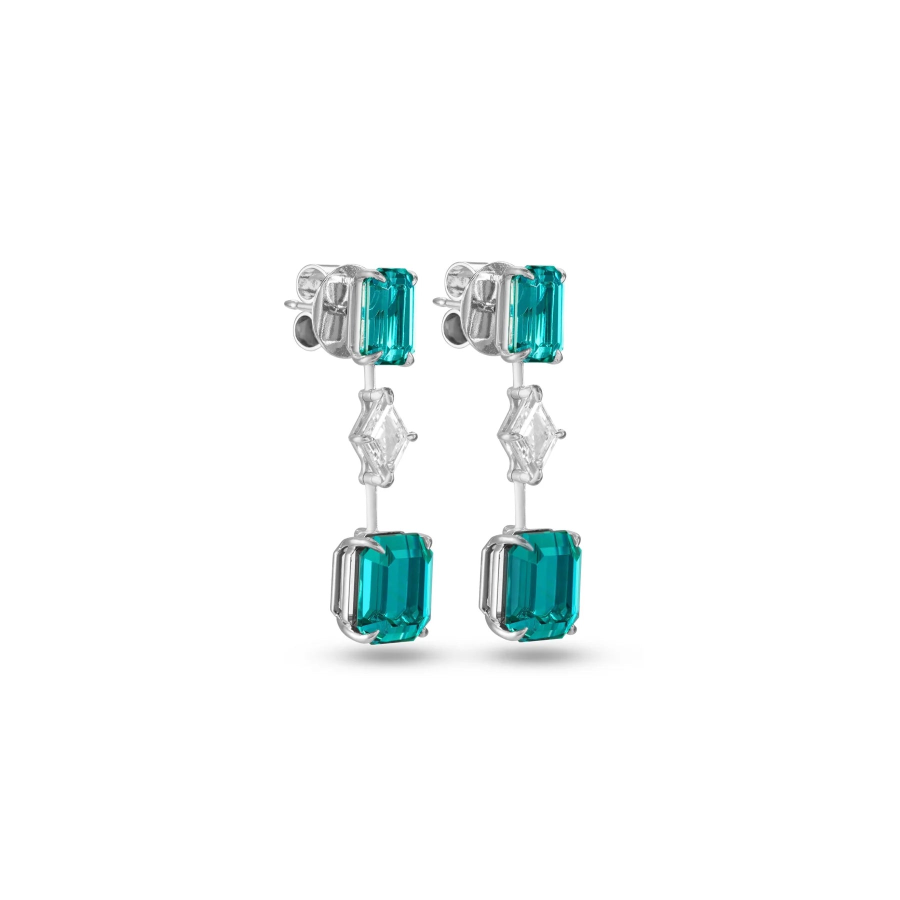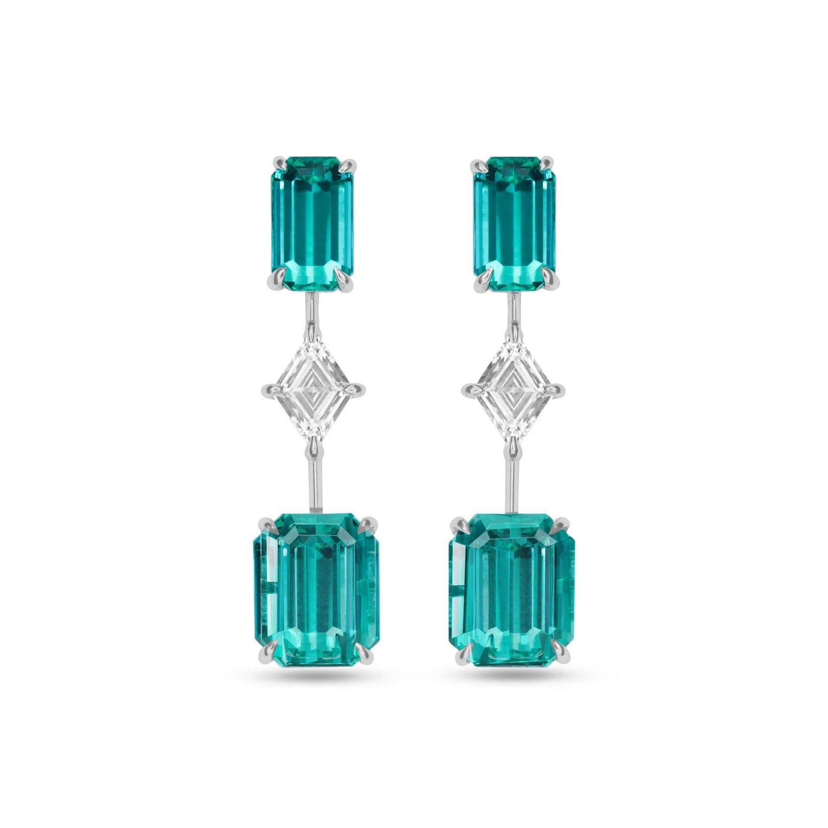 Lagoon Tourmaline and Diamond earrings, set in 18k White Gold. Earring pair features a 11.91ct "cuprian" Tourmaline and .51ct D VS1 and .48ct E VS1 lozenge-cut Diamonds. Sold as a pair.