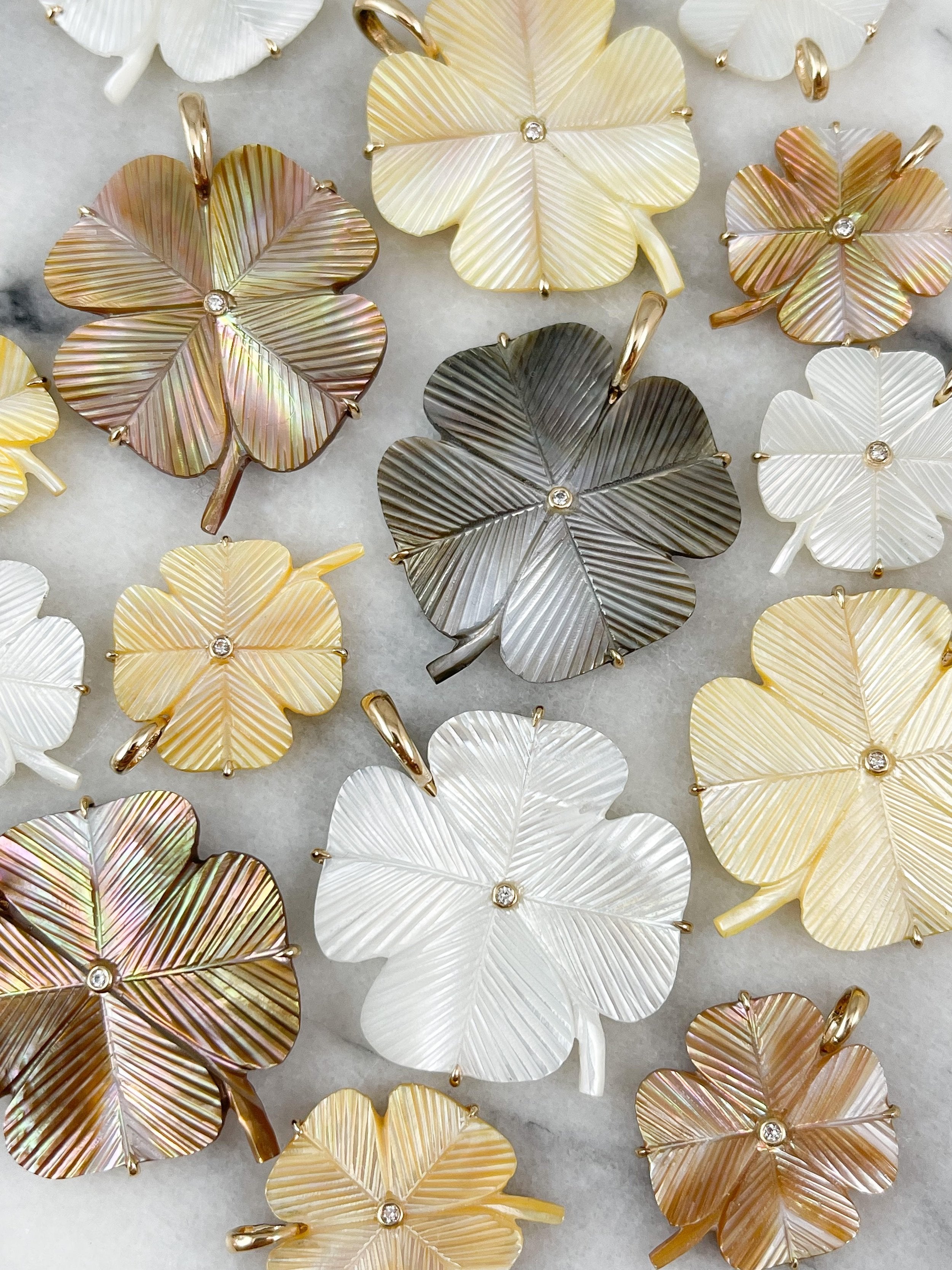Our large Clover pendant is hand carved and set in 14K Solid Gold with an inlaid diamond. Pendant: 40mm.