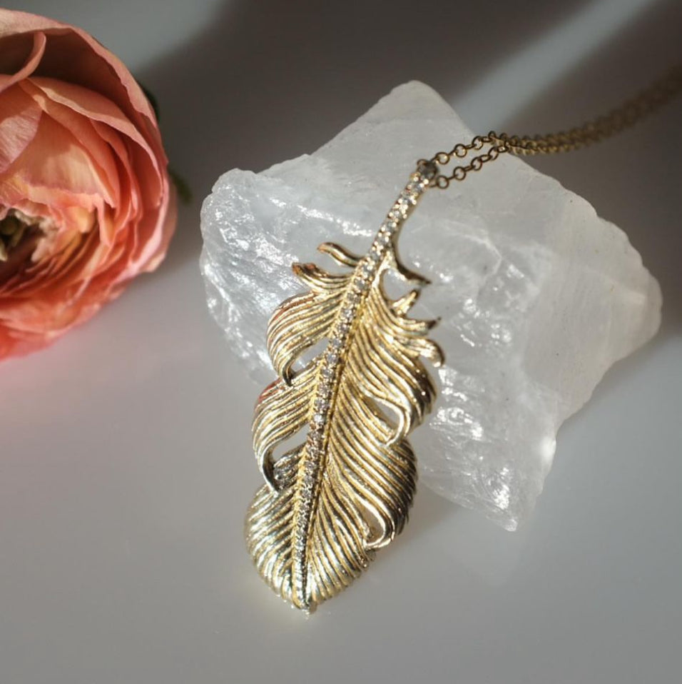 Feathers represent trust, love, honor, strength and power. This diamond feather was created and carved by hand before it was cast and hand set with diamonds. Pendant: 1.5 inch Length.