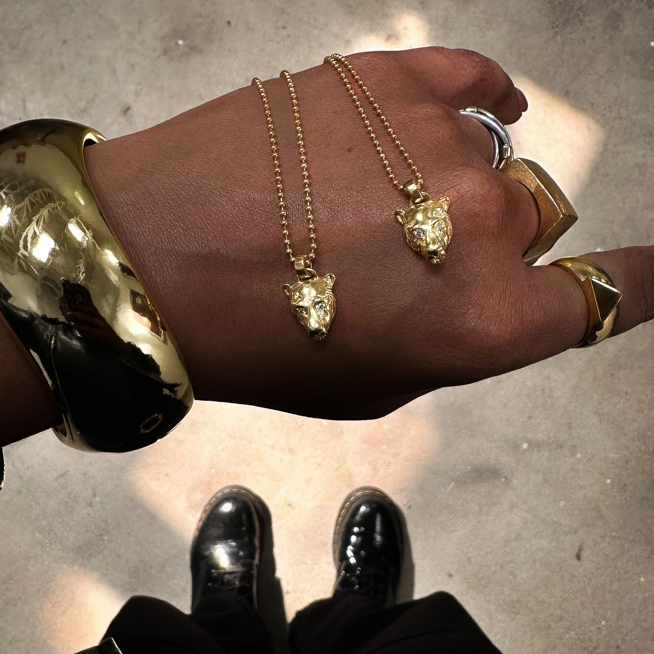 The Lioness represents the goddess and divine feminine energy. She embodies creativity, imagination and inspiration. Worn as an addition in layering or by itself, this Gold Charm necklace hangs on a 14k plated ball chain and is lightweight and easy to wear. Round white Diamonds, .04cts total, in the eyes.
