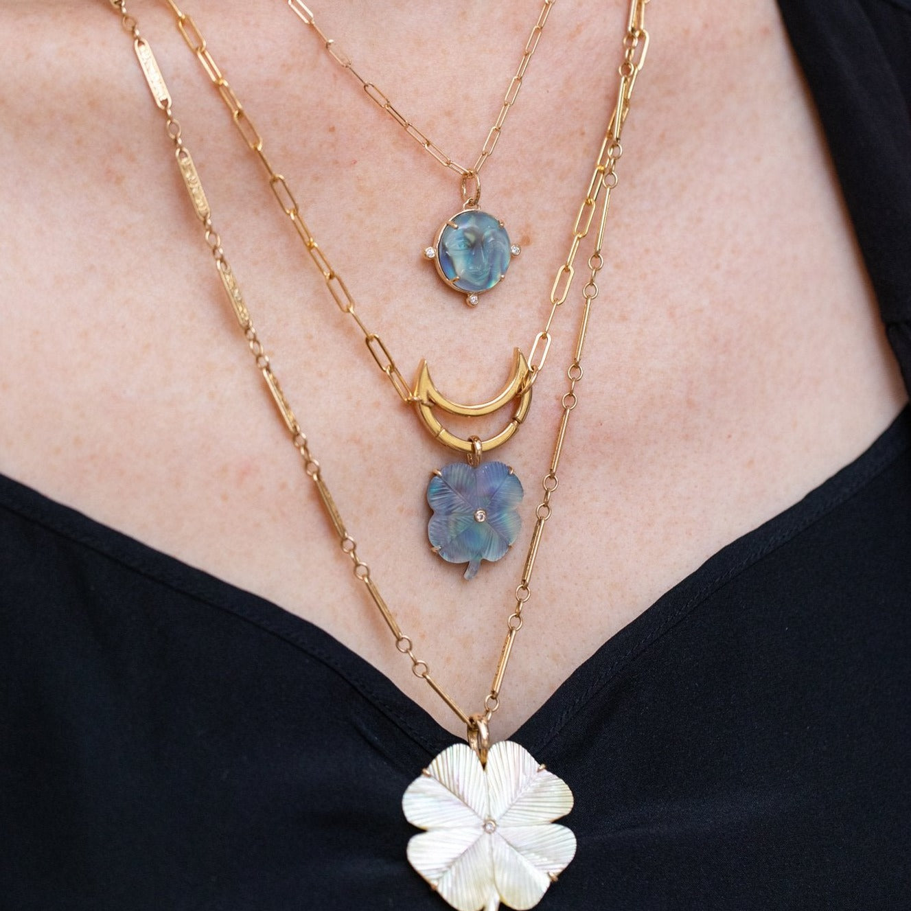This Good Luck charm gets her luminescent glow from a special carving and layering process whereby we set a thin disk of abalone shell beneath a hand carved cloudy chalcedony surface.