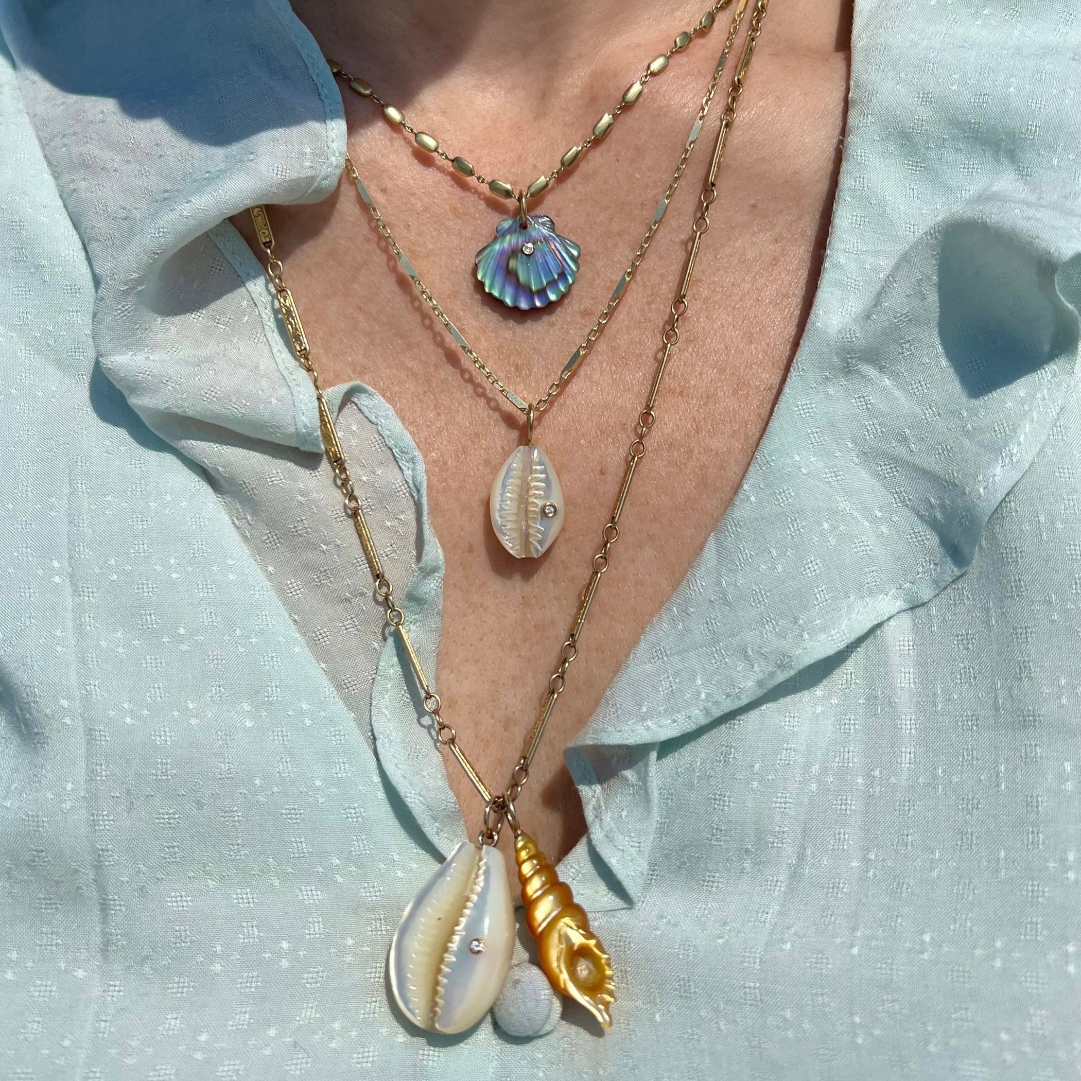 Inspired by the scallop shells scattered along the shoreline of the Atlantic Ocean, which Maura grew up collecting every summer in Longport, NJ, our Luminescent Scallop Shell is carved from Abalone and clear Chalcedony, and accented with a sparkling Diamond set in 14k Yellow Gold. Pendant: 15mm length x 14mm width. Sold as a charm only.