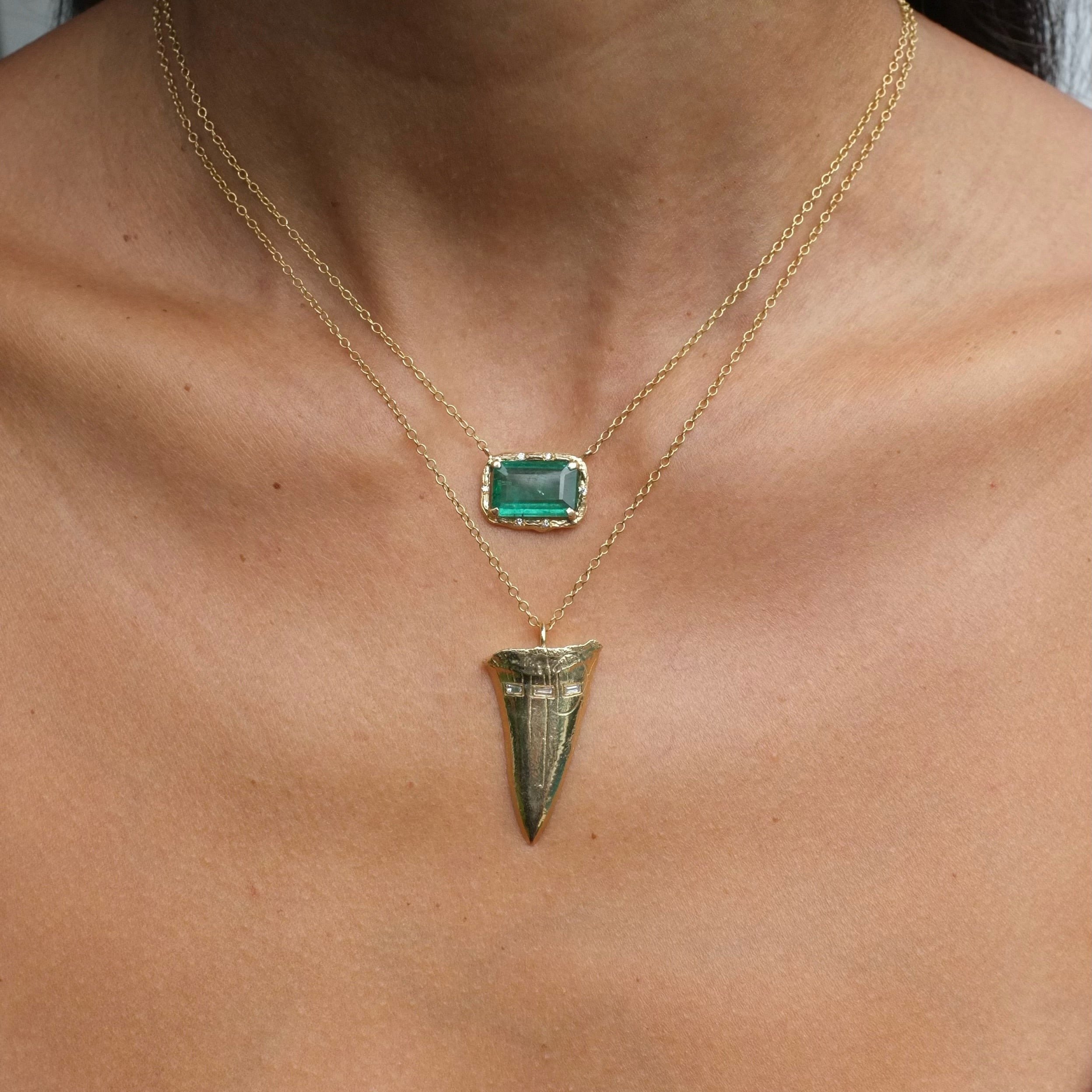This 16 million year old mako shark tooth fossil was found at Shark Tooth Hill in California. It was then cast in to solid gold. The shark is a symbol of power, strength, and tenacity. It is a reminder that we must be careful not to take things for granted. The shark reminds us to stay focused on our goals and to never give up. This necklace is 18 inches in length and holds white baguette diamonds along the top. Pendant: 1.25 inches Height.