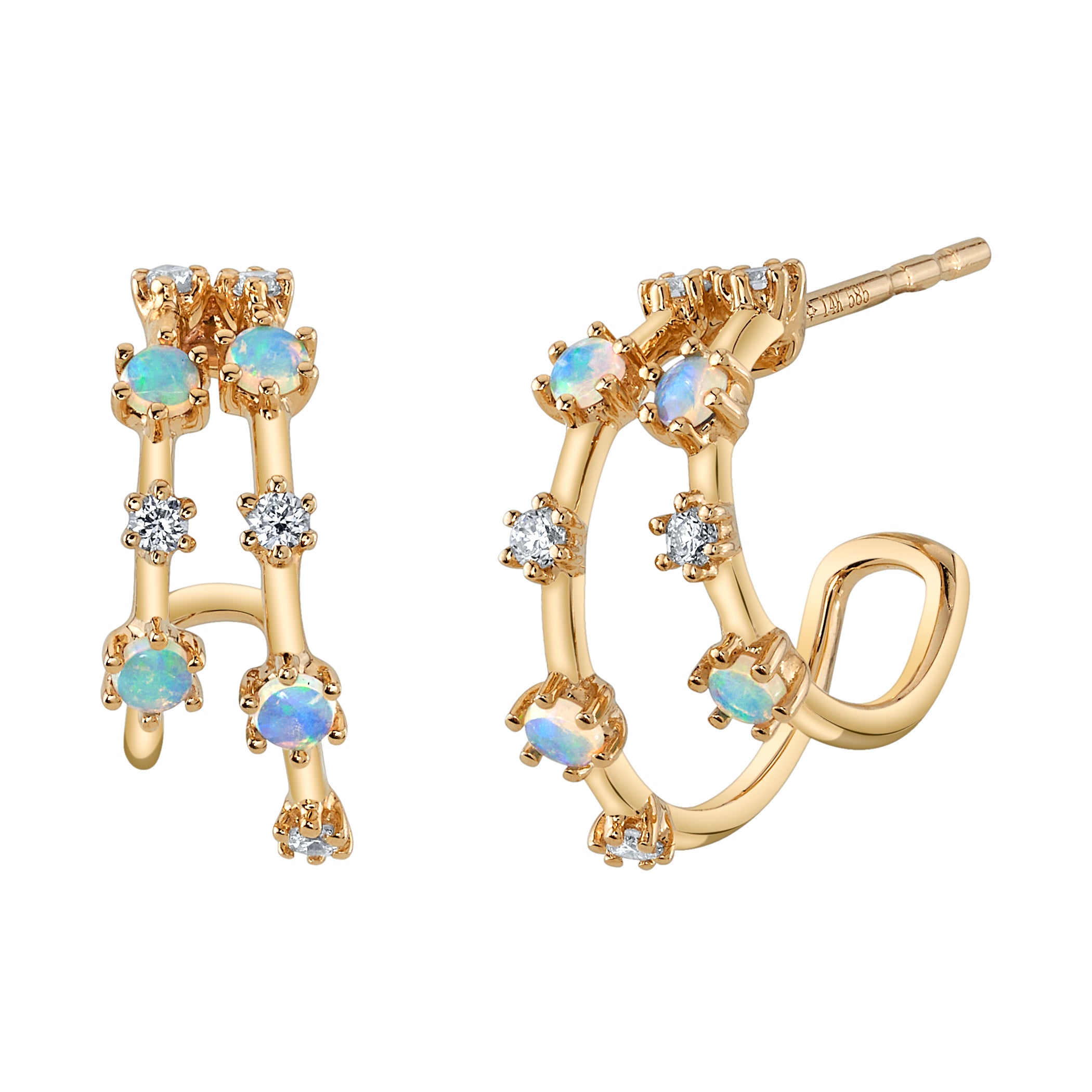 Half-huggie hoop with alternating stones, set in 14k Yellow Gold Opal. Opal, Emerald or Sapphire and White Diamonds are prong set along the loop in an alternating pattern. Meant to hug the earlobe for that barely-there look.
