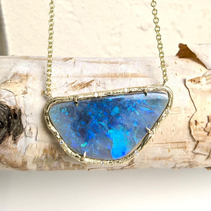 This gorgeous One of a Kind Australian boulder Opal necklace is set in our Willow btanch wire with scattered Diamonds. Opal enhances cosmic consciousness and stimulates originality and creativity. Willow branches are symbolic of flexibility and strength for their ability to bend without breaking. This pendant sits on a 17 inch rolo chain.