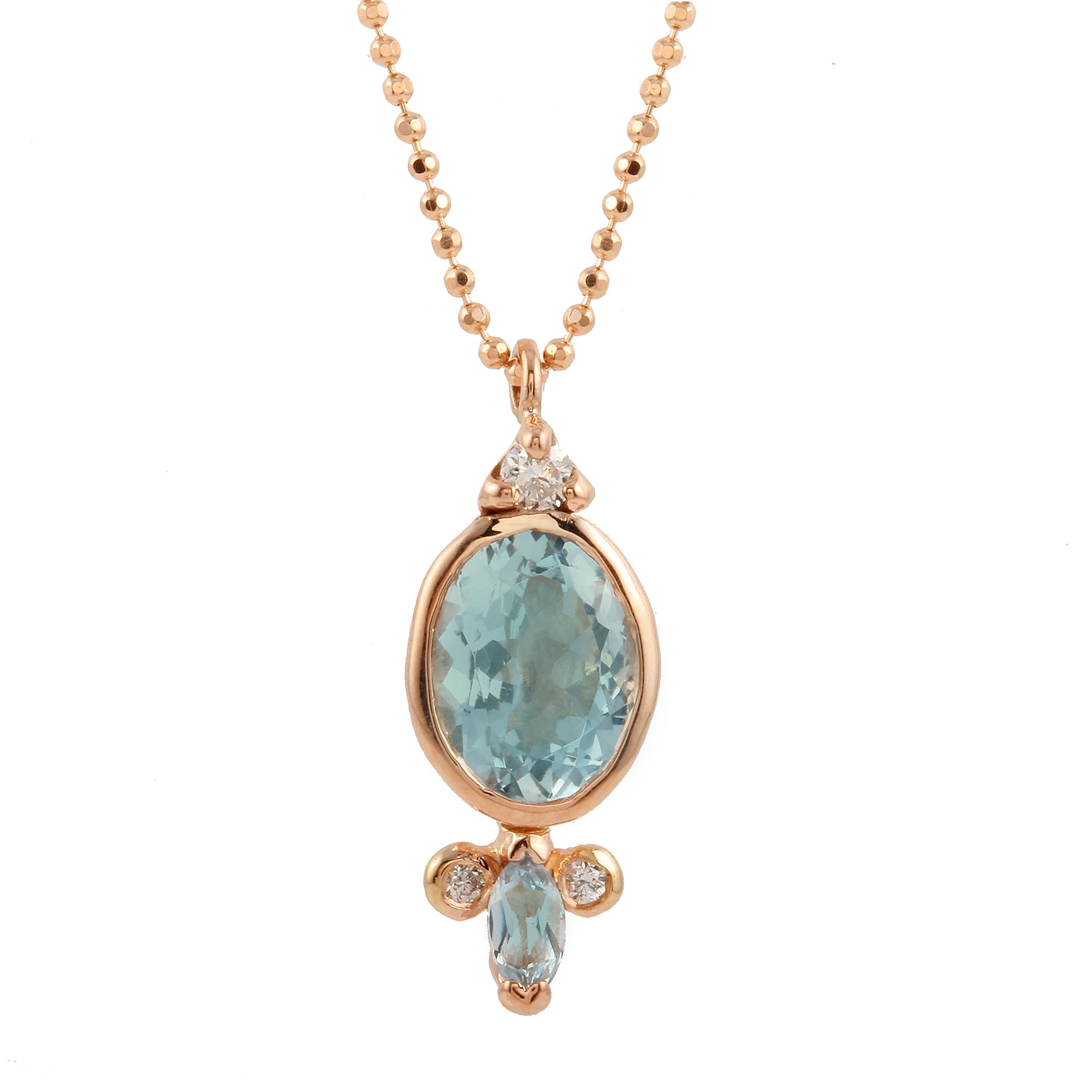 This stunning necklace features an oval shaped and a marquise shaped aquamarine on a rose gold diamond cut ball chain. Diamonds accent the larger stones creating a beautiful sparkle effect. Aquamarine, water of the sea, is the stone of courage and strength. It evokes calmness and serenity to its wearers. 18 inch chain.