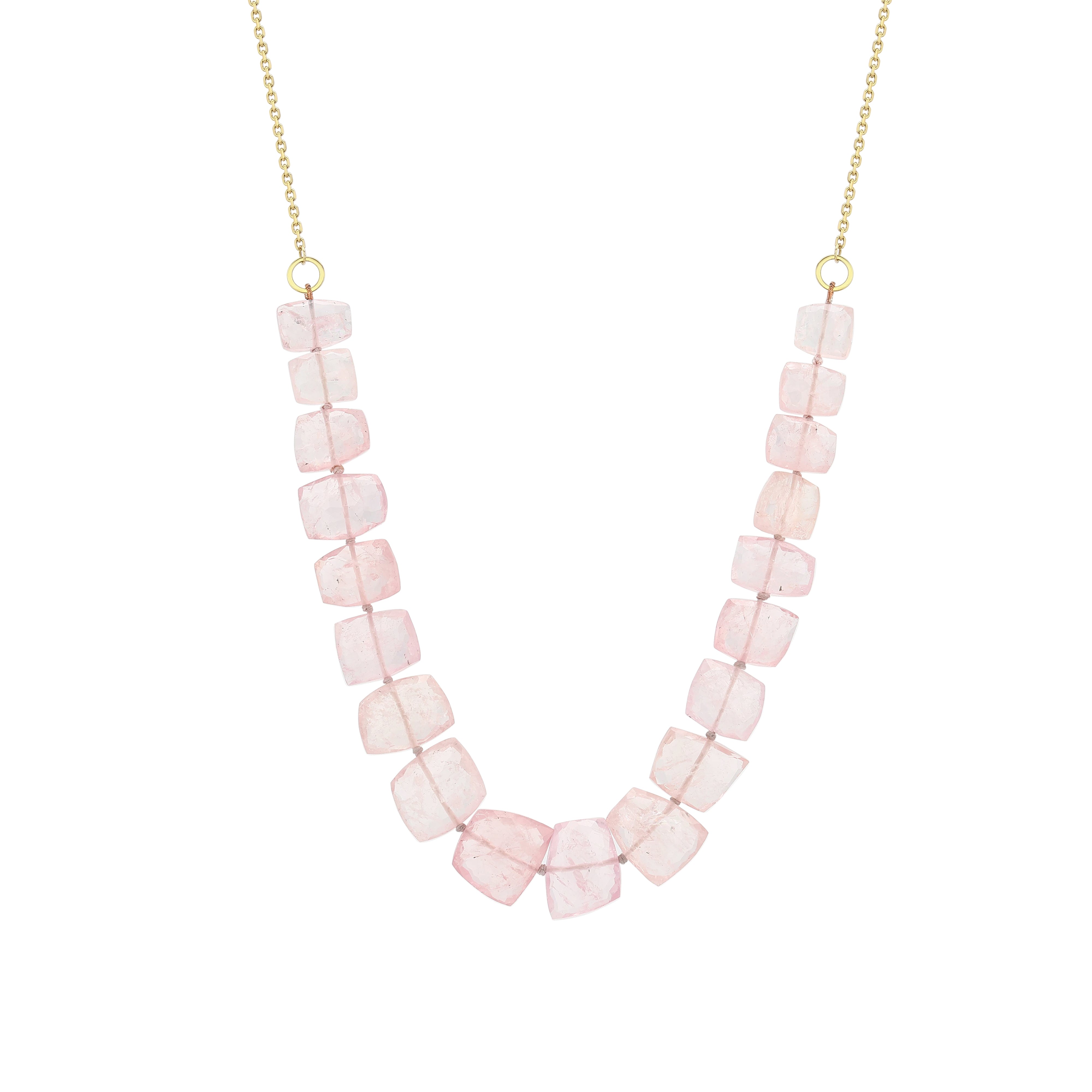18k Yellow Gold pink Morganite Beaded Chain Necklace. Necklace is 28 inches in length.