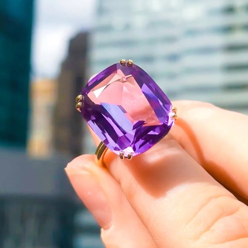 A daring statement of glamour, this oversized cushion-cut cocktail ring commands attention with timeless flair. "Gossip" Collection's cushion Ring with tube shank at 18k Rose Gold. The lavender Amethyst stone is set at approximately weight 16.68cts. Stone: 28.60mm length x 20.90mm width.