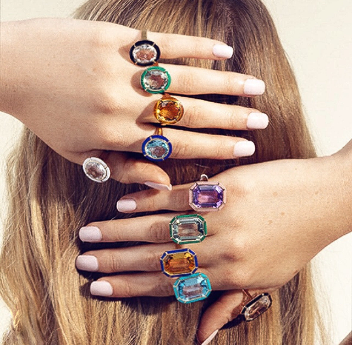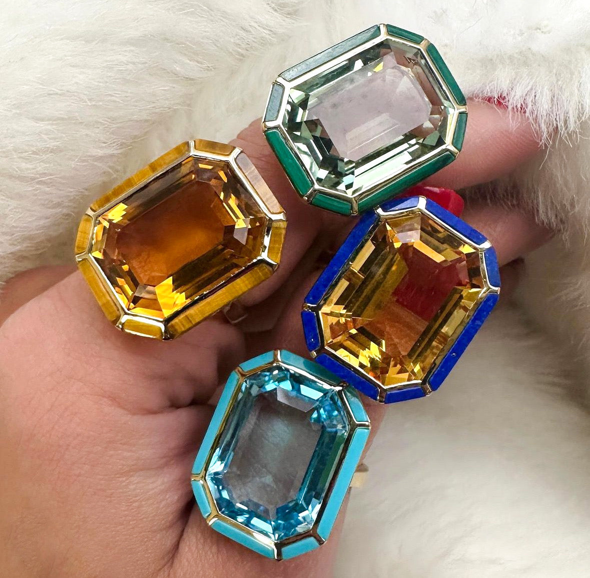 'Melange' stone with inlay, Ring set in 18k Yellow Gold. Approximately 15cts in Prasiolite or Rock Crystal, 14ct Citrine. Stone: 19.2 x 14.2mm.