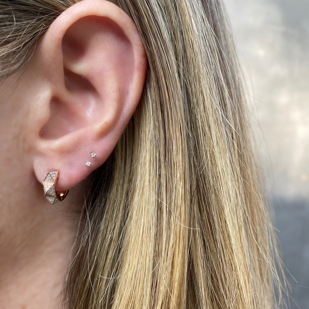 Pyramid spike huggies with pave Diamonds. Choose yellow, white, or rose Gold.