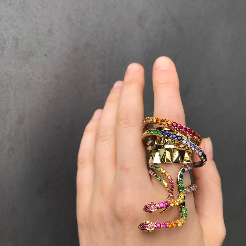 Spectrum structured rainbow ring with 2.48ct of Ruby, Citrine, Sapphire and Tsavorite pave inset stones. Ring is set in 14k Rose Gold.