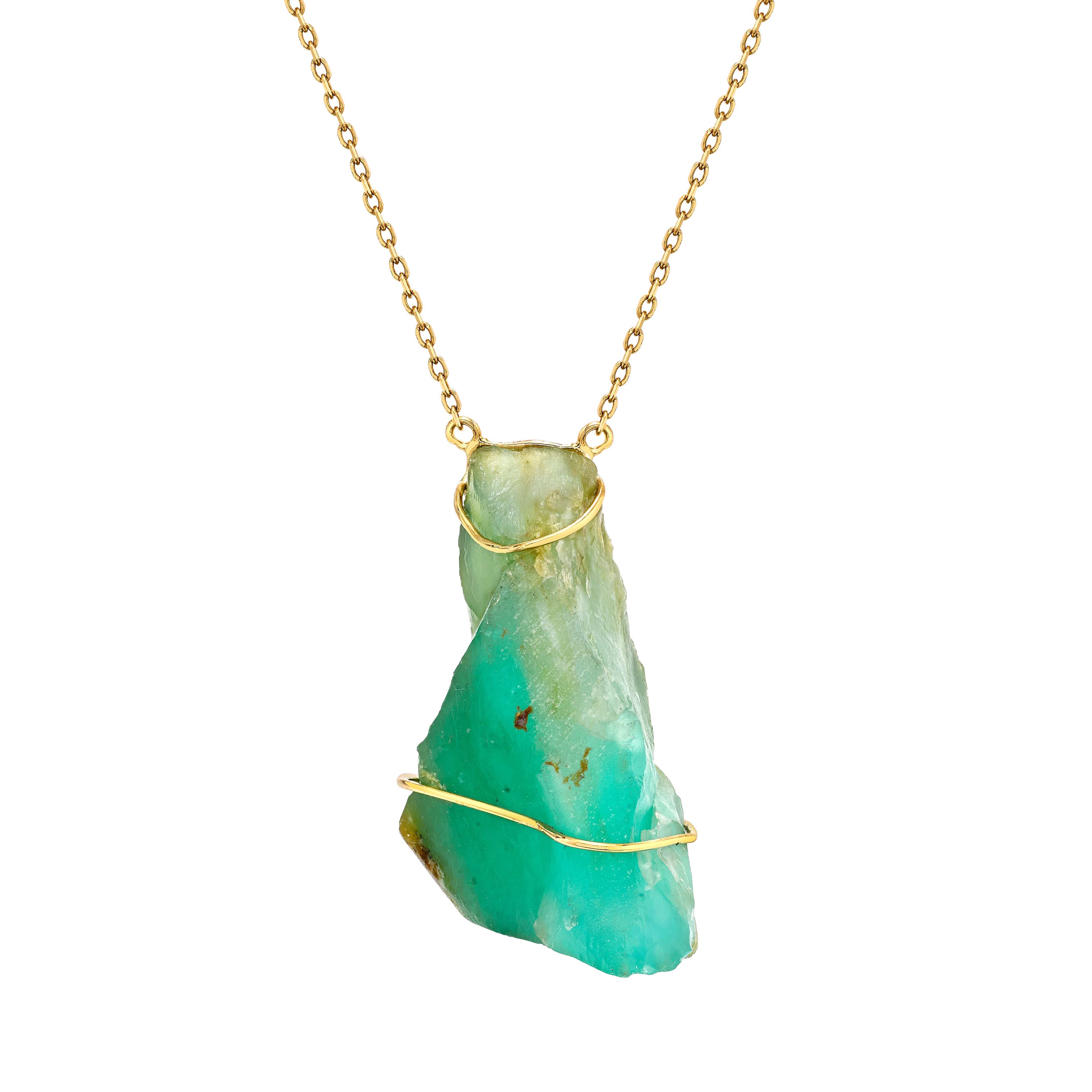 Each piece is one-of-a-kind in appearance due to the natural variation in the materials. The raw stone hangs on an 18k chain.