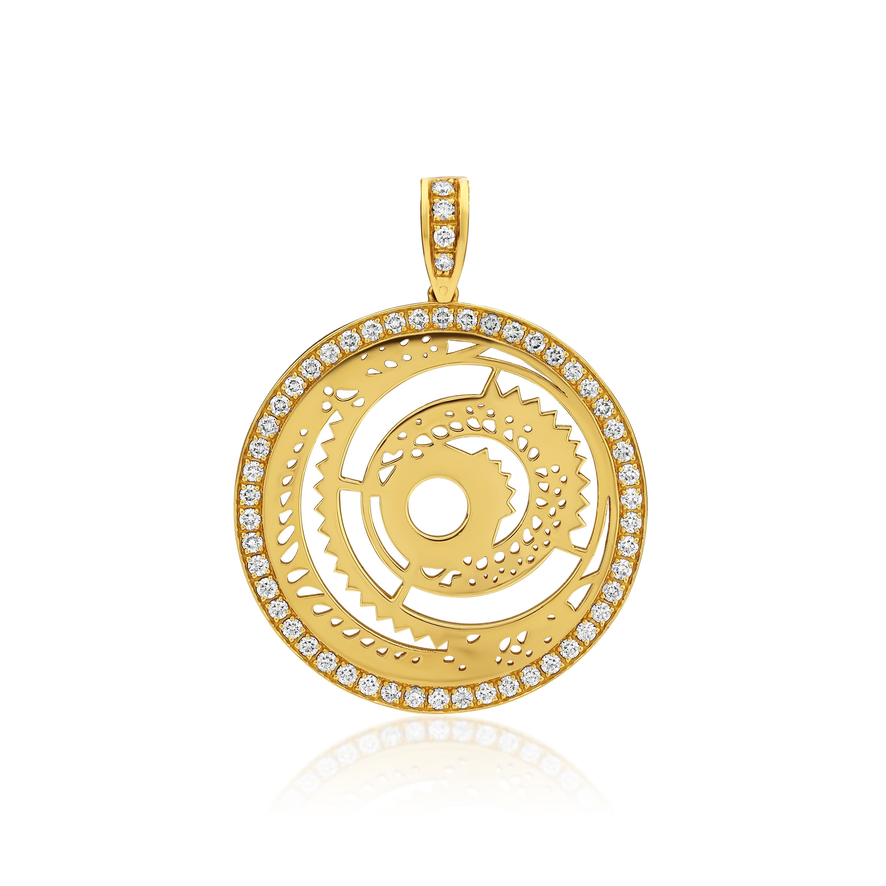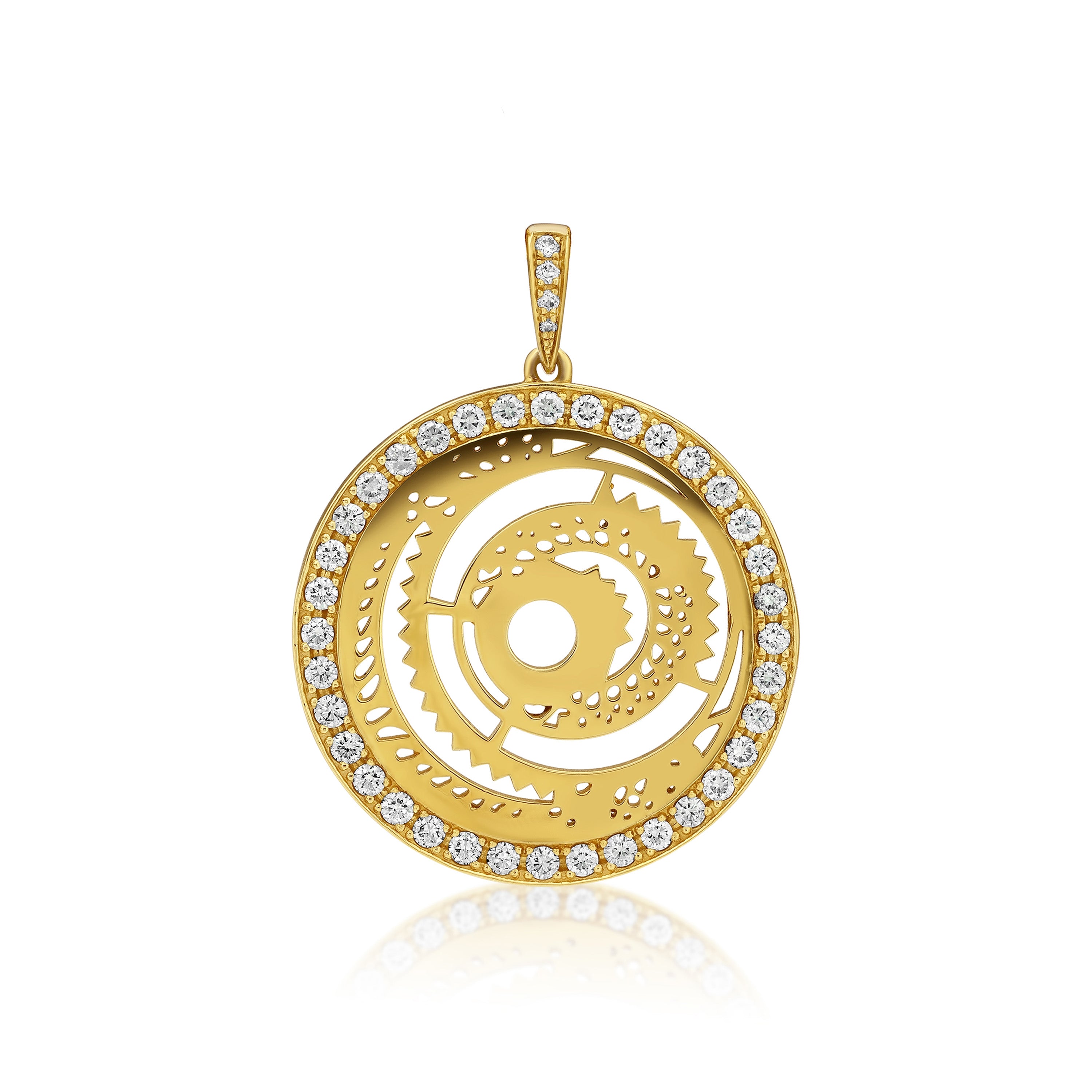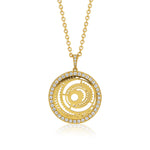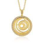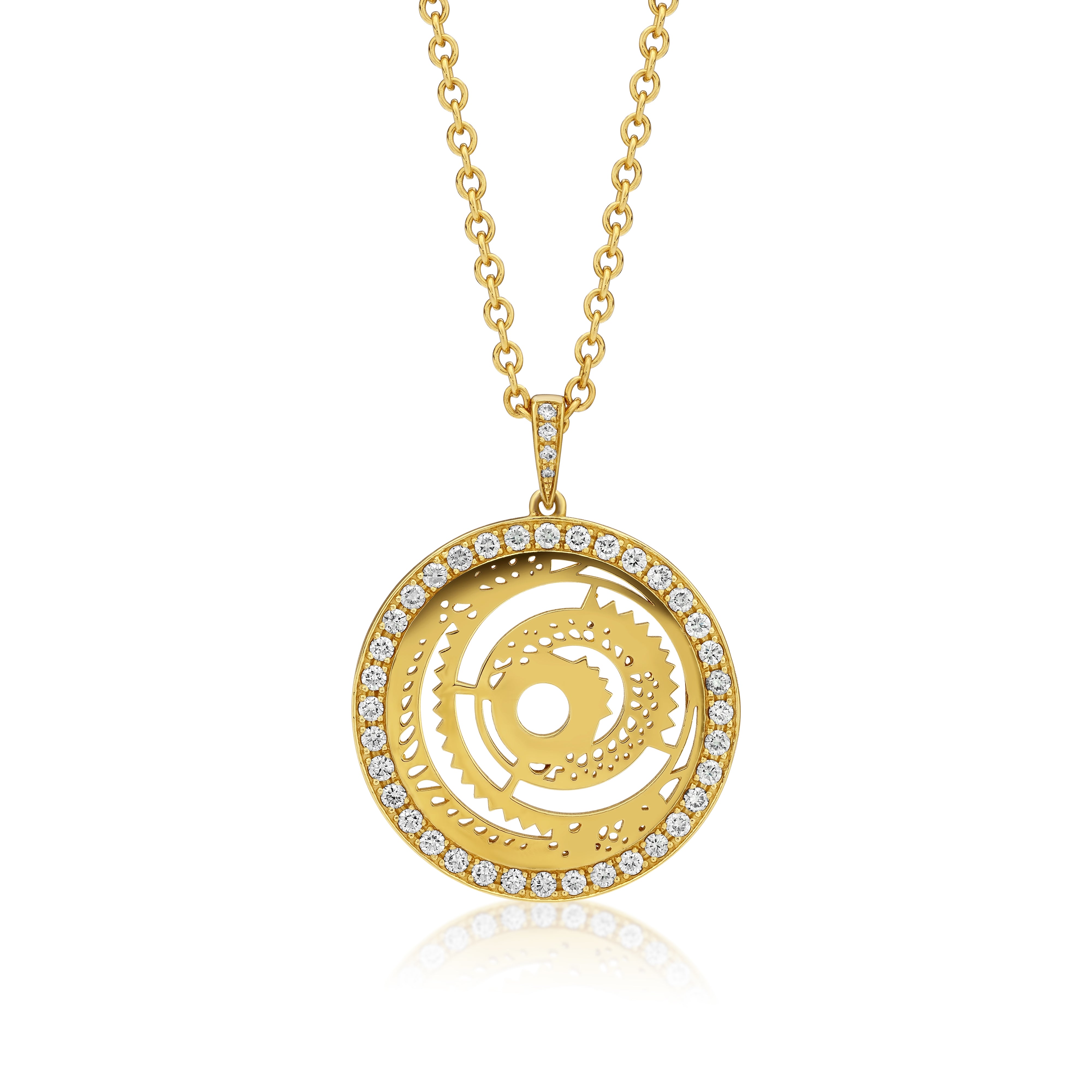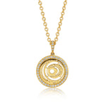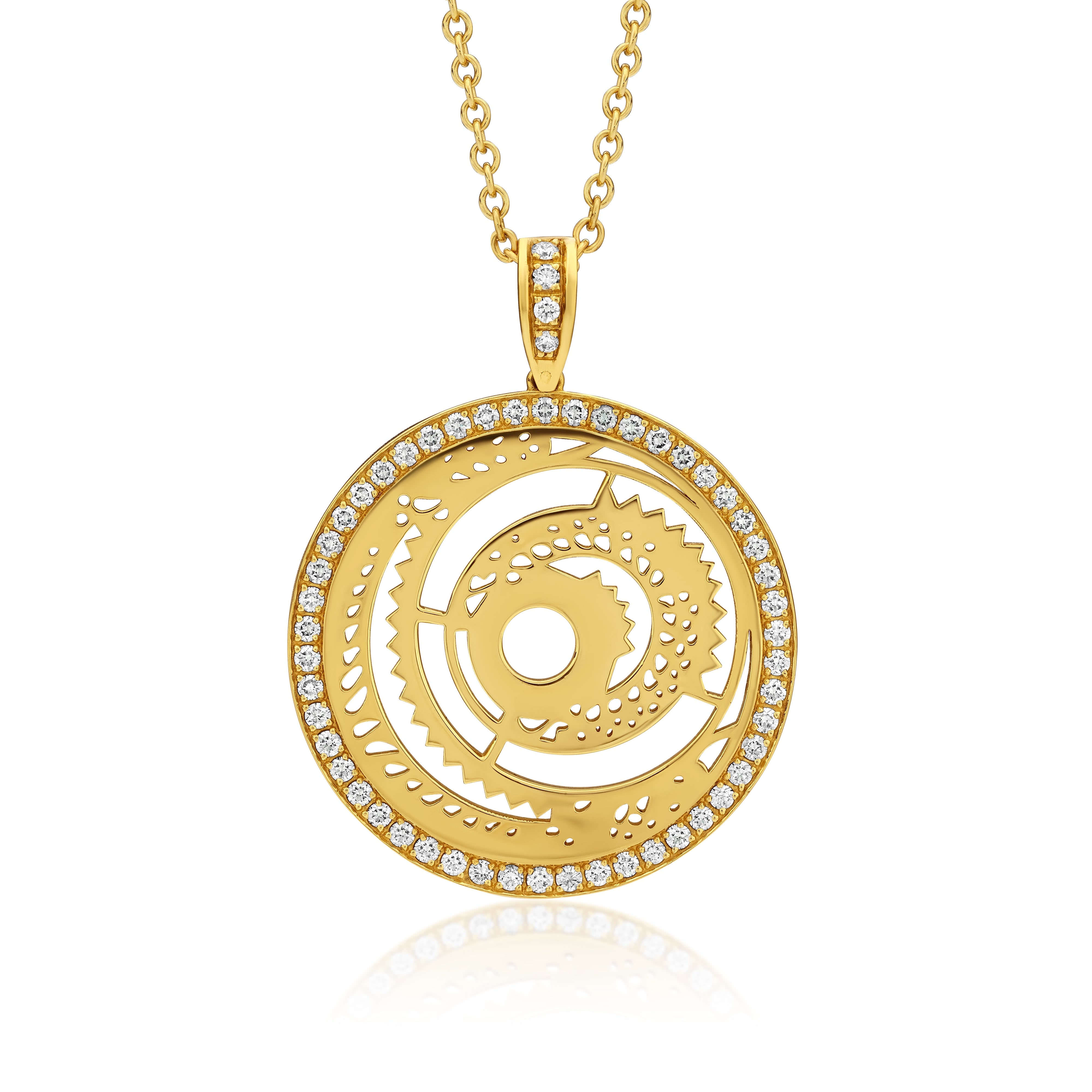 Inspired by the first light cresting the ocean horizon, the Rising Sun Pendant us a quiet nod to new beginnings. Carved golden rays surround a solid 18k Gold center, encircled by a delicate ring os Diamonds. Available in two sizes: 19.6mm Small, 37mm Large. As a necklace also available with an 18k Italian Rolo chain. Diamond detail: .45cts Small, 1.5cts Large.