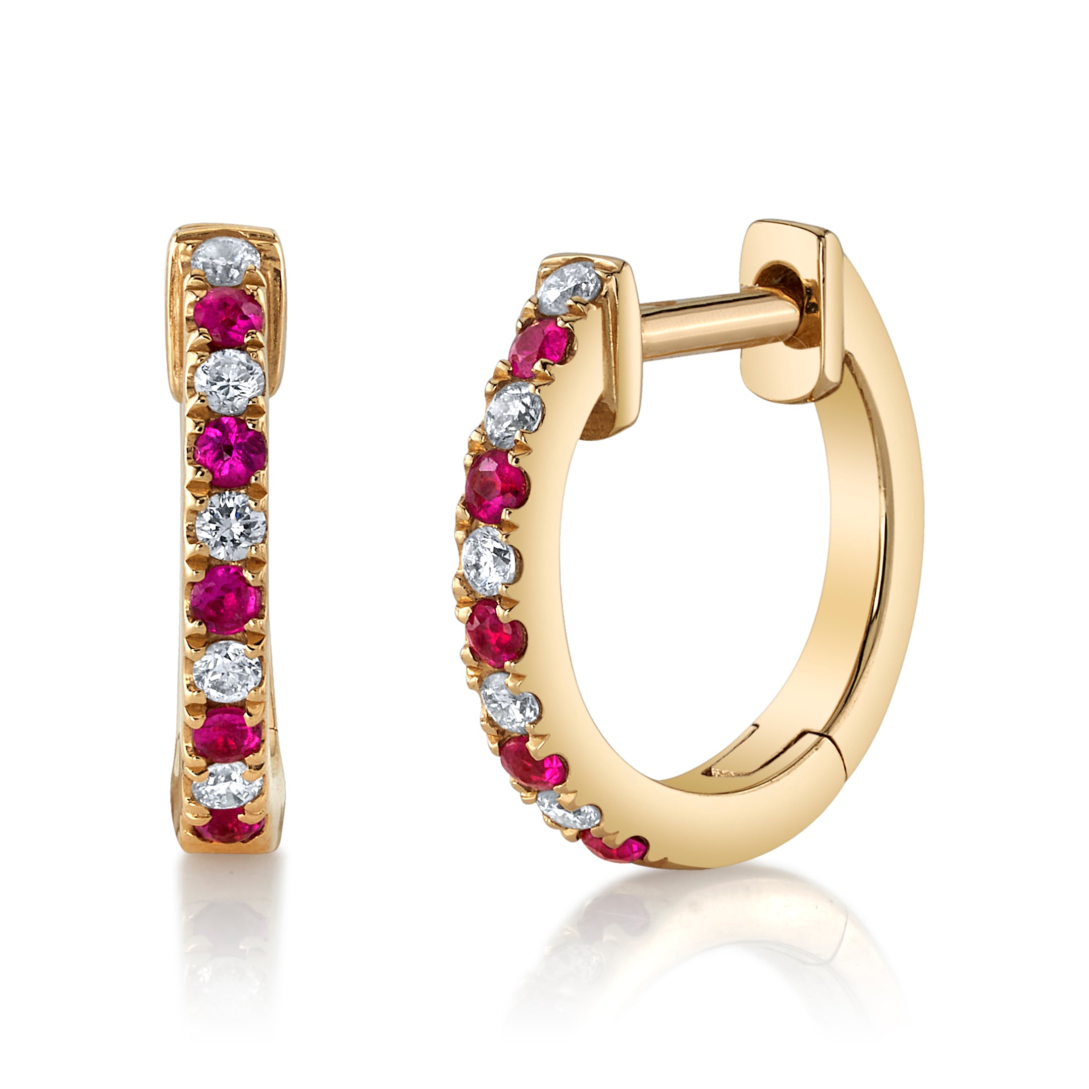 Hinged hoop huggies with alternating Diamonds and Rubies, set in 14k gold.