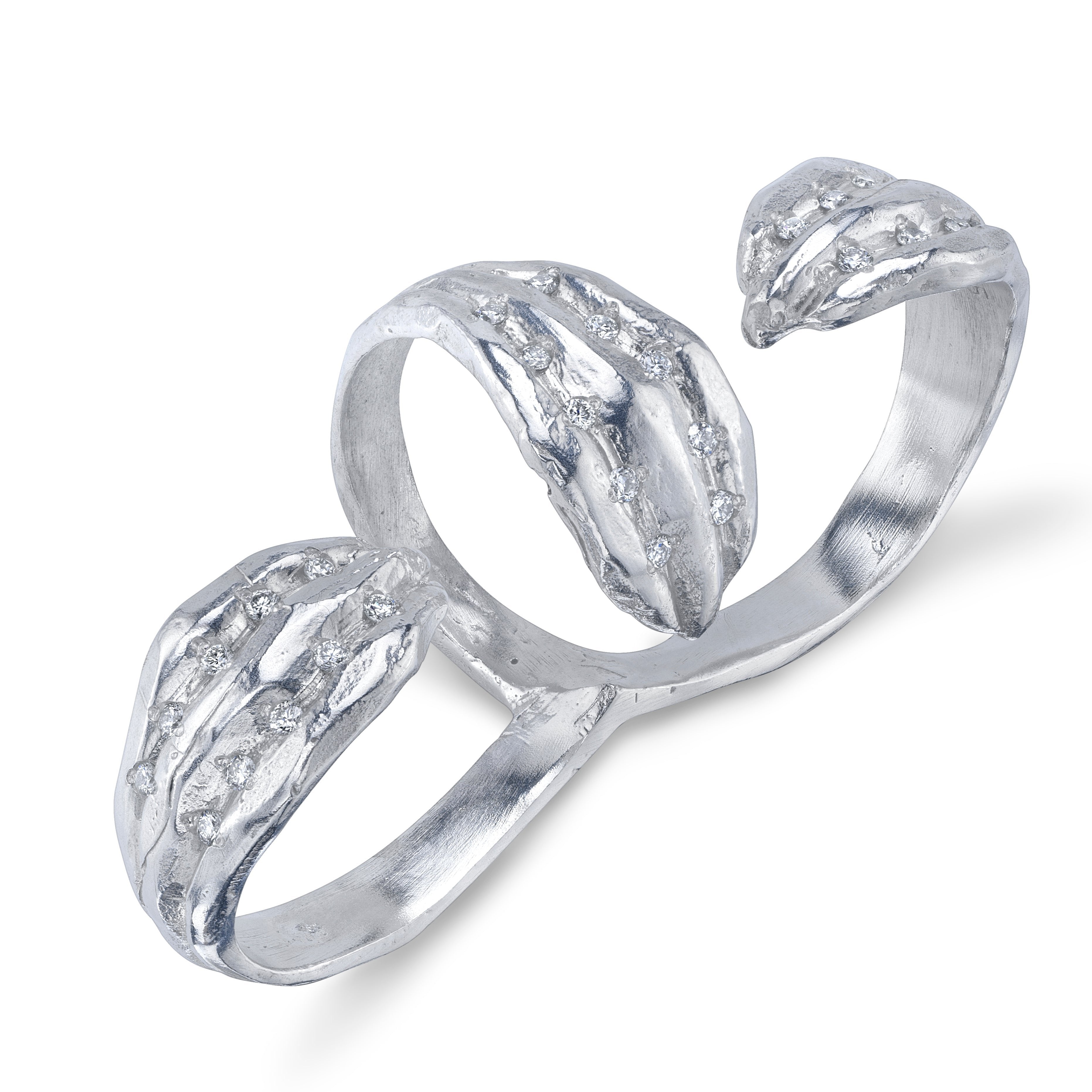 Wrapping two fingers in a stylish cocoon, the round diamonds will make your hand sparkle. This Roseark signature design ring would make a beautiful gift to bring a little bit of happiness into someone's life. Size Adjustable. This Ring pairs with Saffron Cuff. Choose between Sterling Silver or Black Rhodium Sterling Silver.